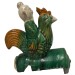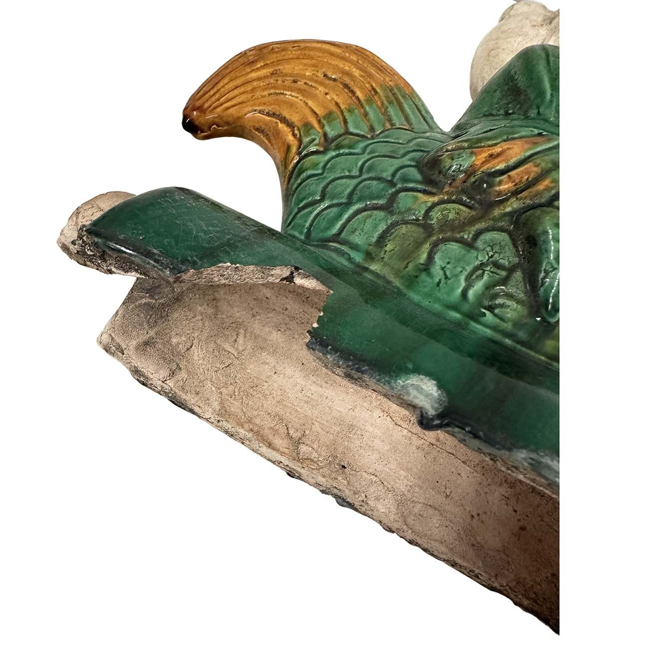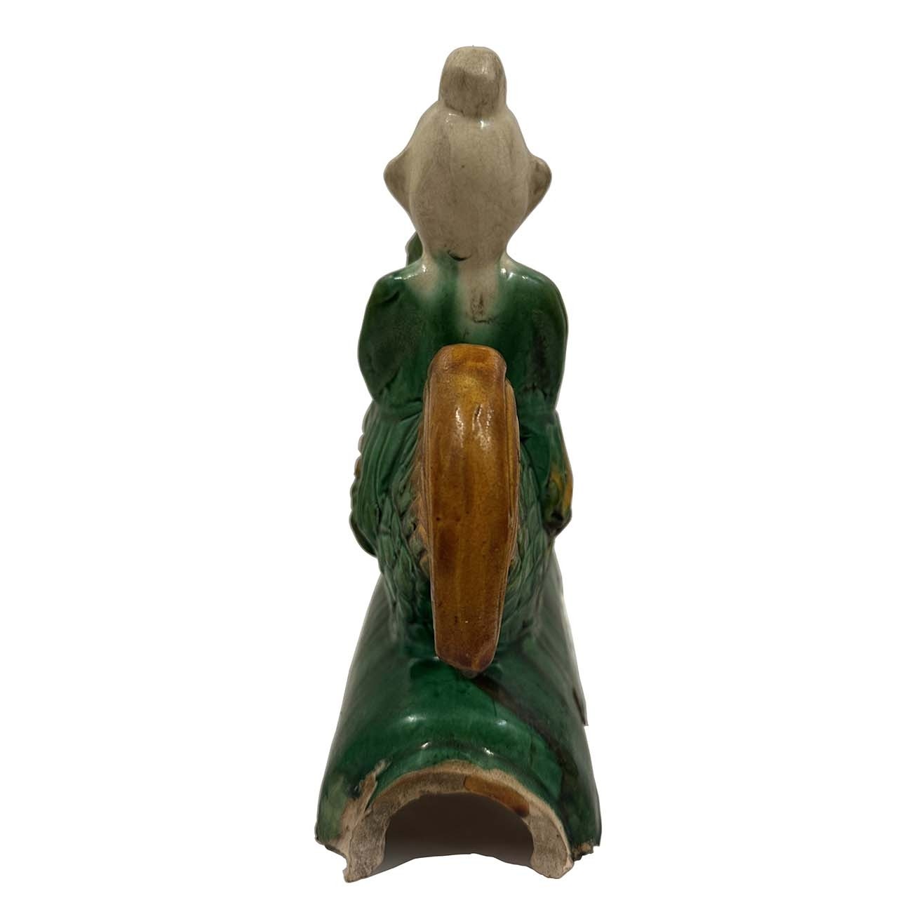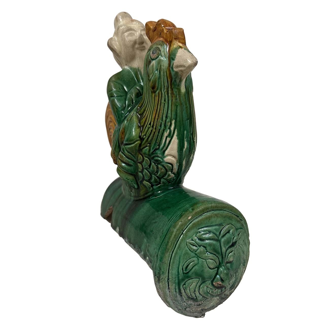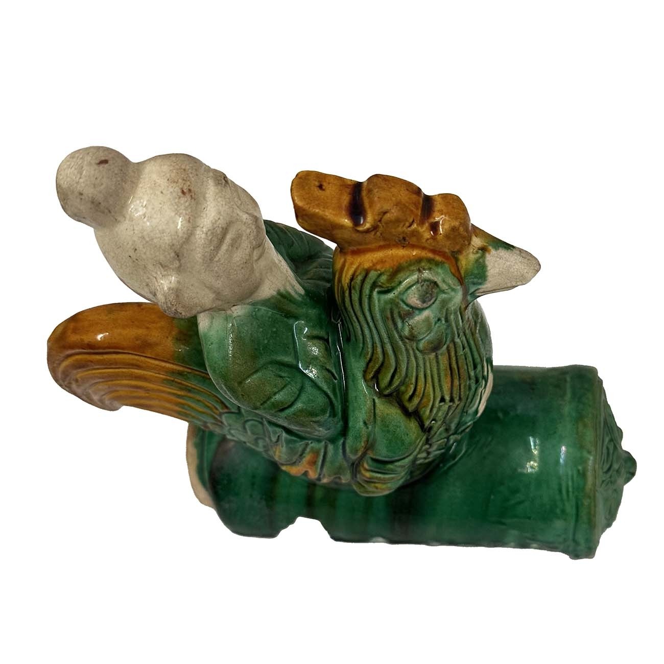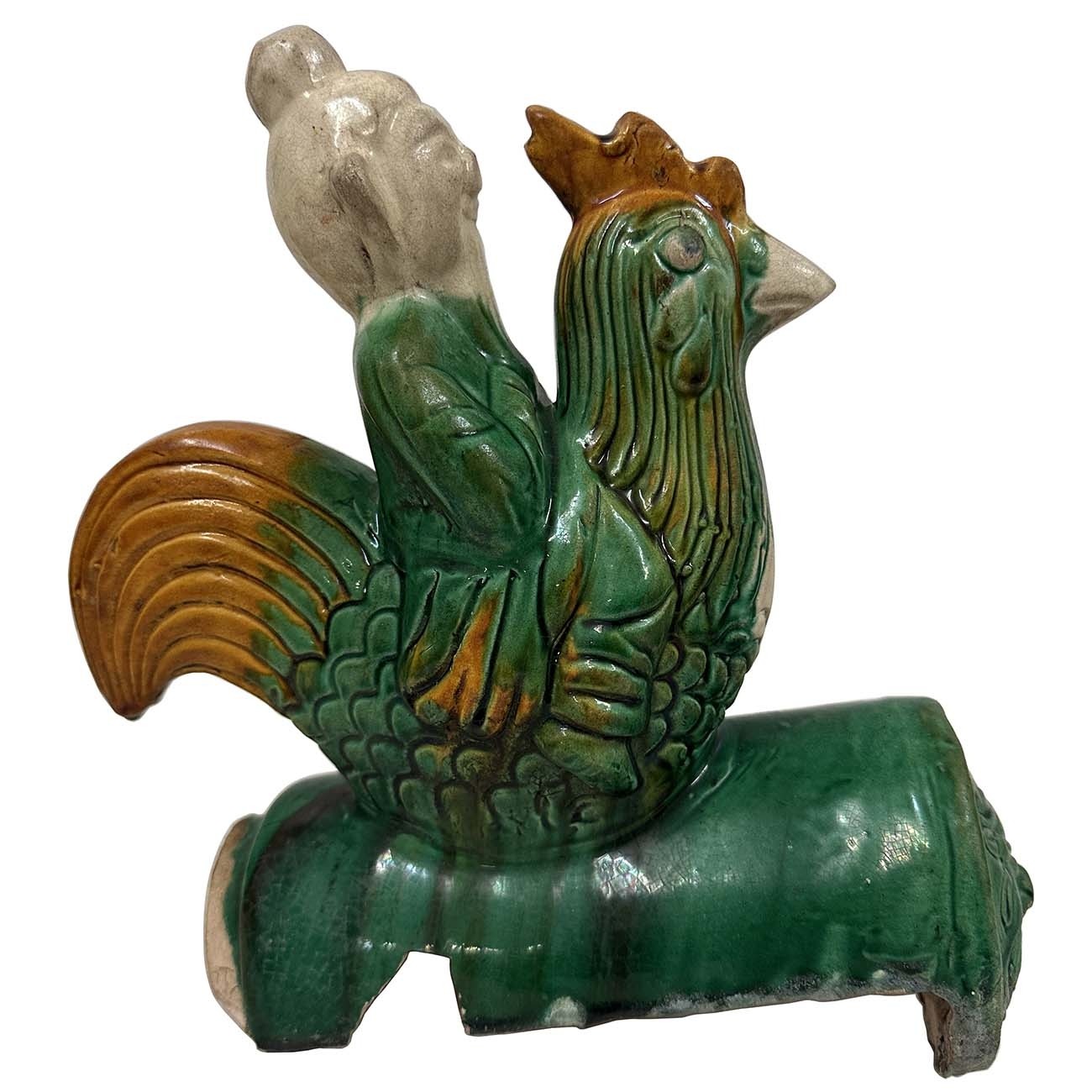 This Vintage Chinese Ceramic roof tile is 100% hand made and hand carved of Chinese traditional design. Roof tiles modeled in dragons and immortals are common on large houses, they are placed on ridges and roof edges as guardians and protectors of public buildings and private homes. This lustrous-colored Sancai roof tile is attributed to the early Qing era (1644-1911). It depicts a Taoist immortal solemnly riding on a green rooster above a circular tile with a guardian lion medallion. The rooster is the tenth sign of the Chinese zodiac. Its chief purpose is to prodåçuce an auspicious aura, which creates a positive cosmic current that would generate favorable Feng Shui that could enhance authority and rank in a career. It was used on top edges of building roof. Look at the pictures, there are some age wears and a small damage on it, but it still shows the beautiful patina.