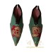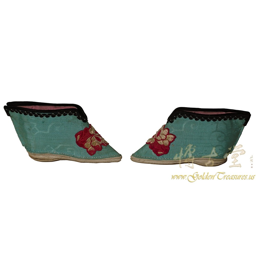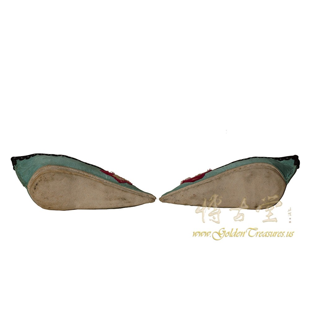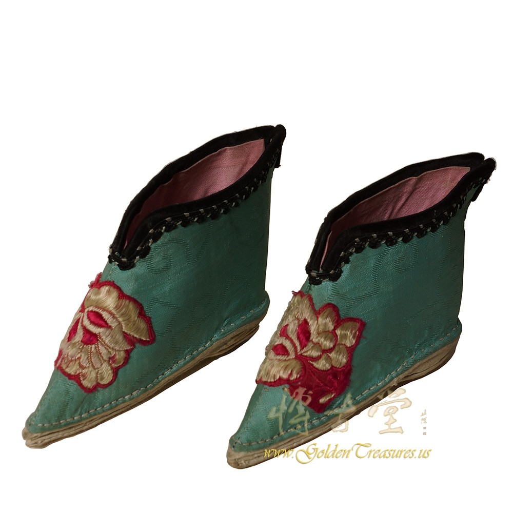 Condition: Hand made, hand embroidered, normal age wearThis Antique Chinese Embroidered bounded lady foot shoes are 100% hand made and hand embroidered of Chinese traditional folks art design. Look at the pictures, there are some discoloring due to the age but over all they are in very good condition. Measurement of each shoe from the back to toe is about 5 inches.