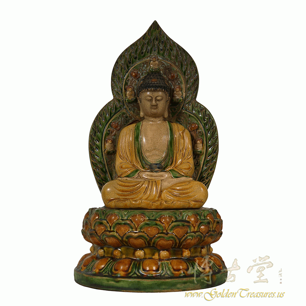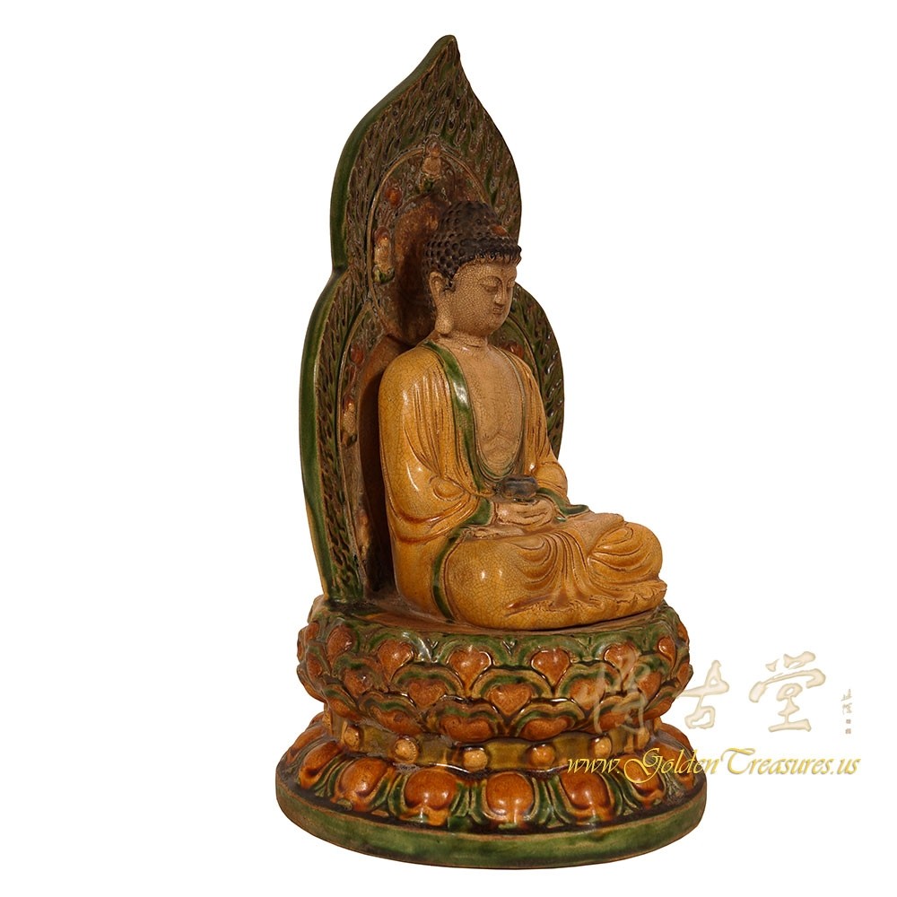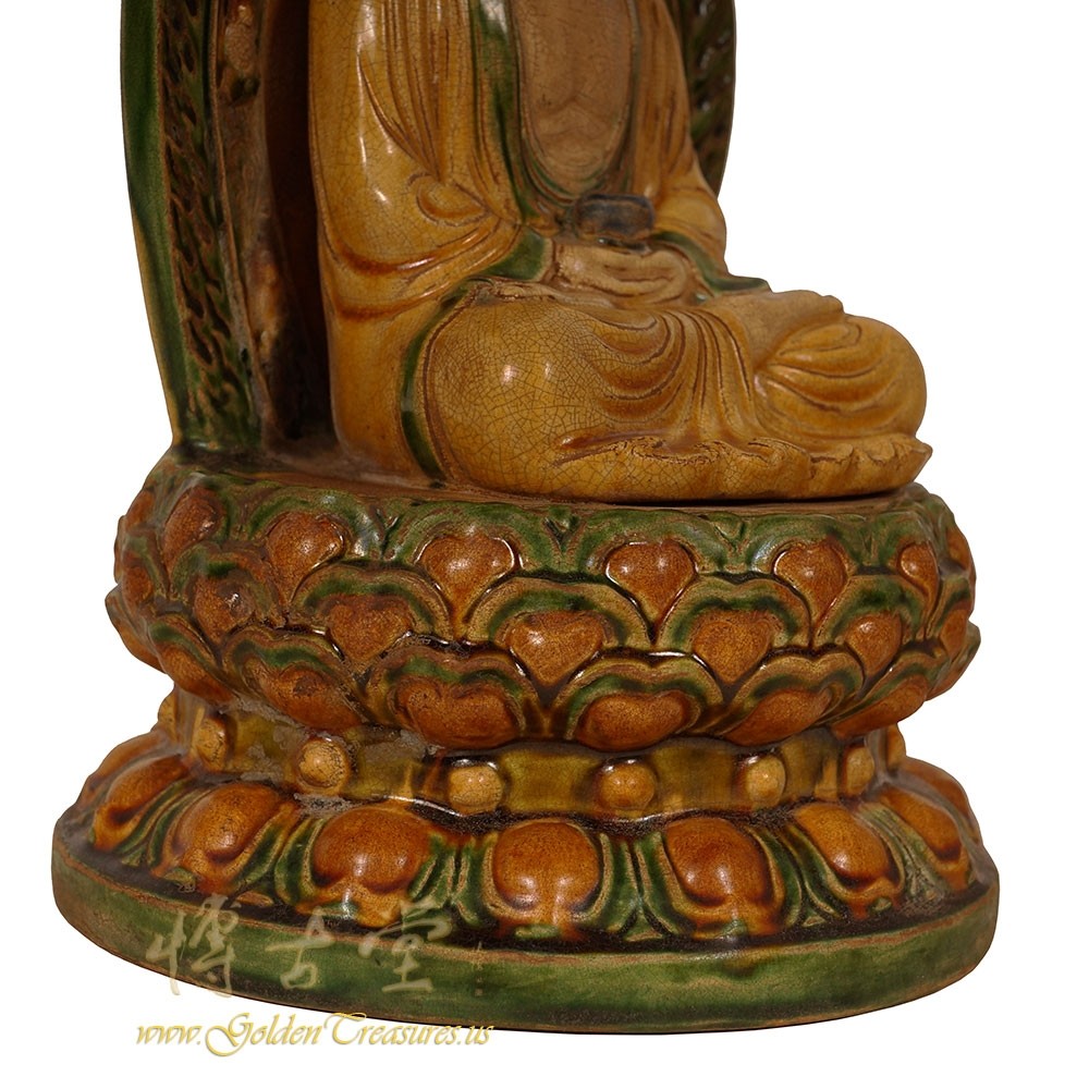 Condition: Original finished, hand made, very good vintage condition with normal age wear.Look at this magnificent vintage Chinese glazed ceramic Buddha Statuary. It shows very detailed hand carving works on it. It is all hand made and handcraft Buddha seating on the lotus seat. You can see from the pictures that they are in many years history with some age wears. Now you can have them on your collection shelf. They are not only a great adornment but also a wonderful gift! Don't miss it.