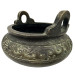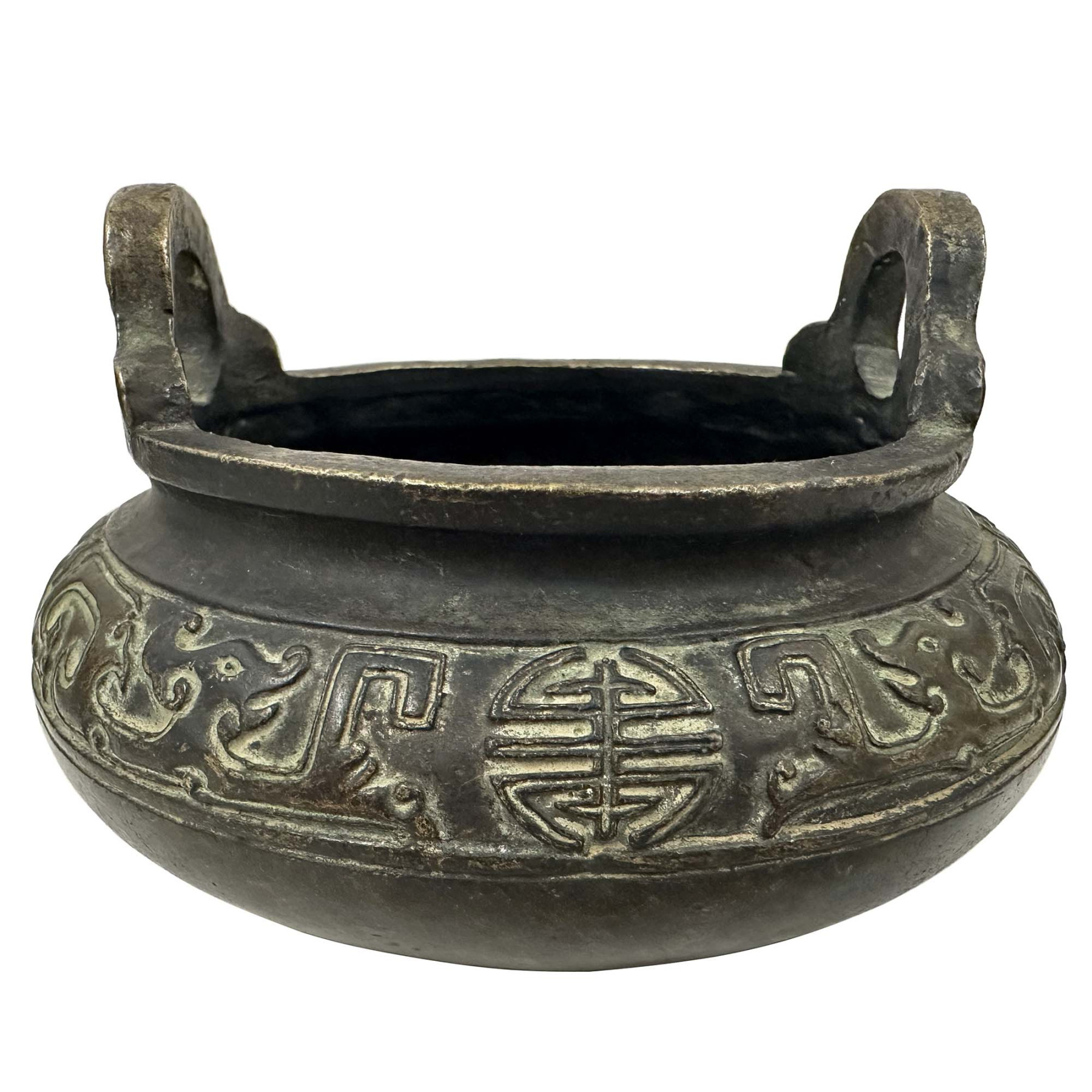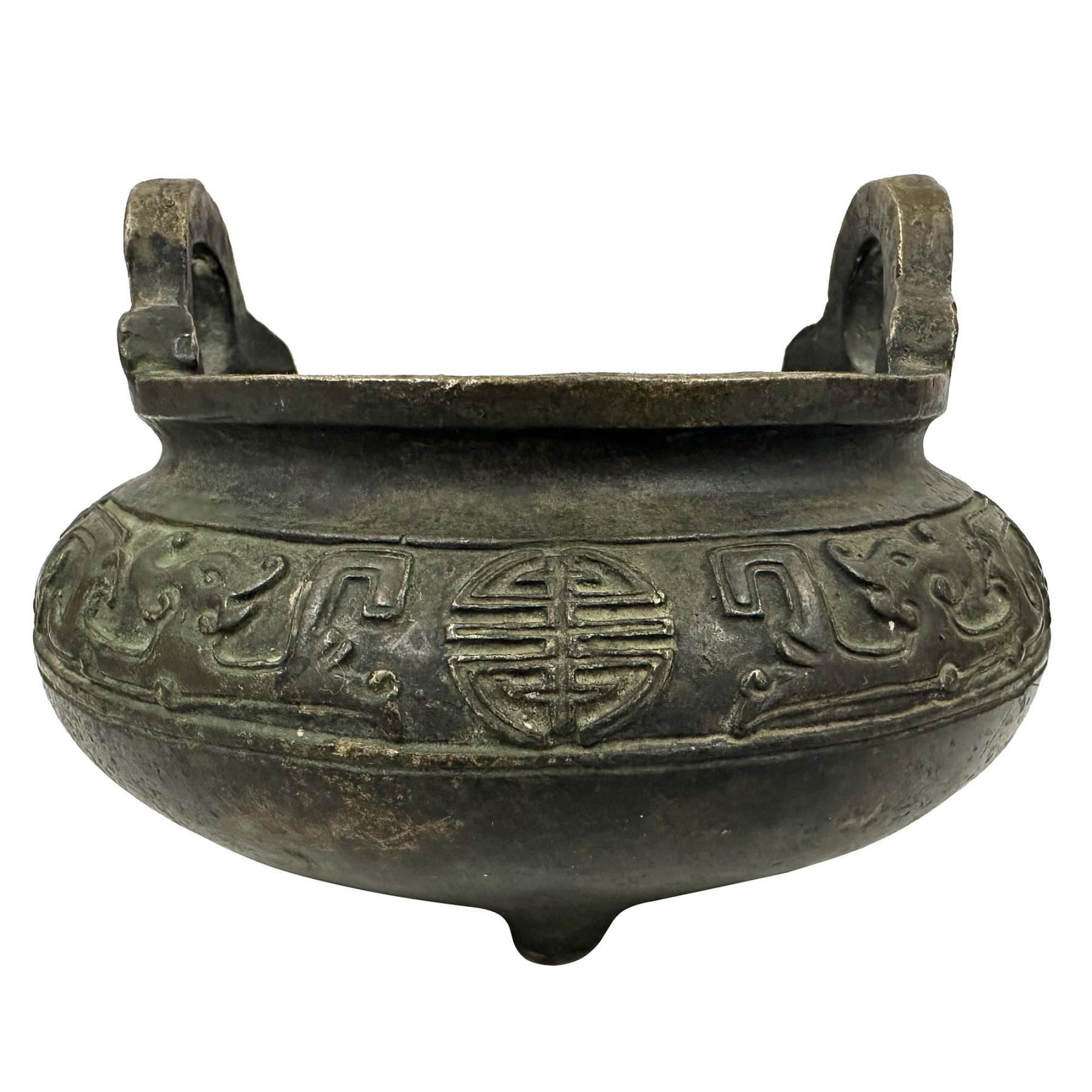 The body features intricate relief patterns, including a central round symbol that appears to be the Chinese character for "longevity" (shou), and stylized dragon motifs around the main body. These types of designs often emulate ancient bronzes from the Shang and Zhou dynasties. This censer is from the Republic period reproduction, used earlier forms as prototypes.