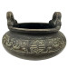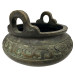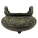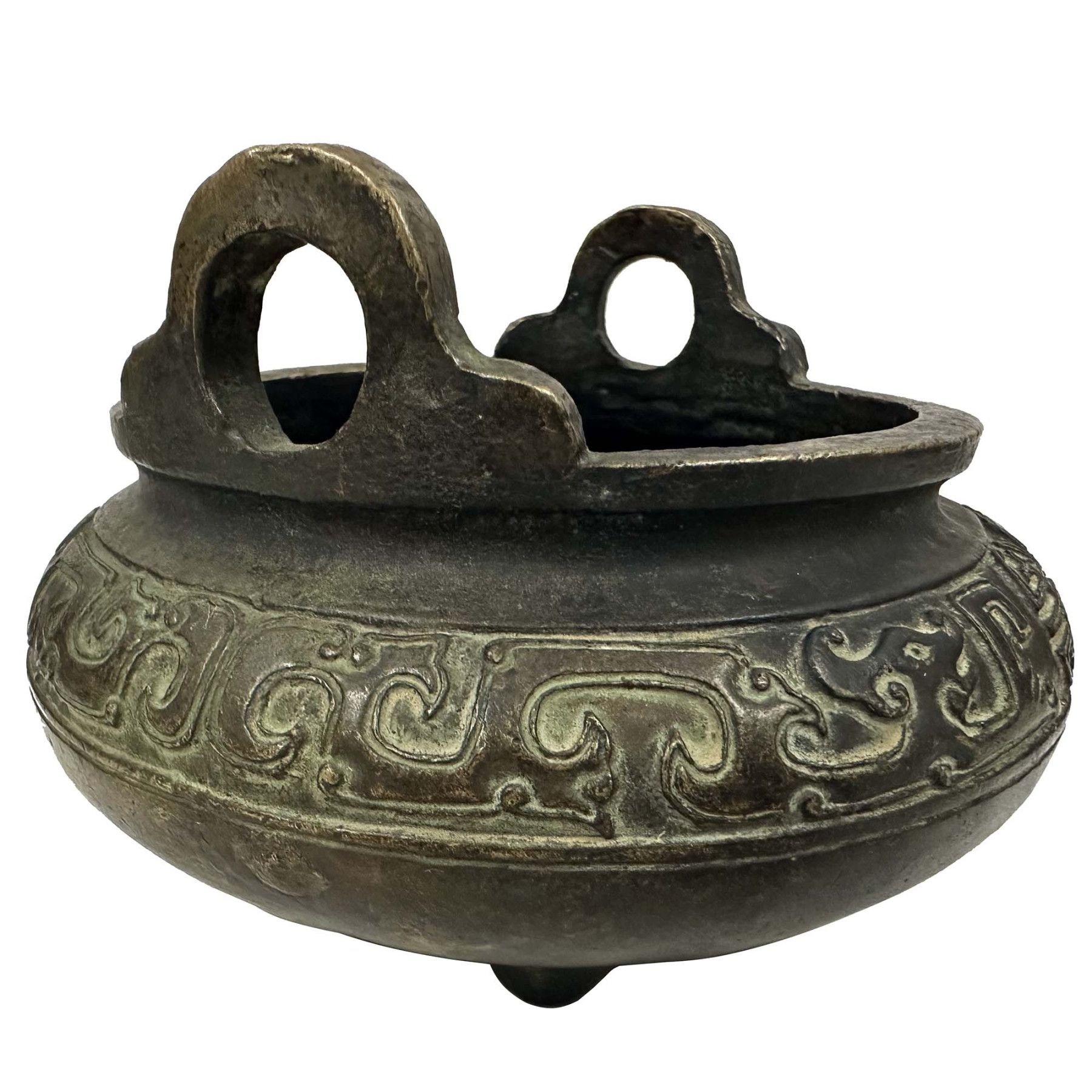 This a Chinese bronze tripod censer (incense burner). The design is heavily inspired by archaic Chinese ritual food vessels known as ding. This censer is made of bronze a three-legged vessel with two loop handles at the sides, a common form for incense burners used in religious and scholarly pursuits.
