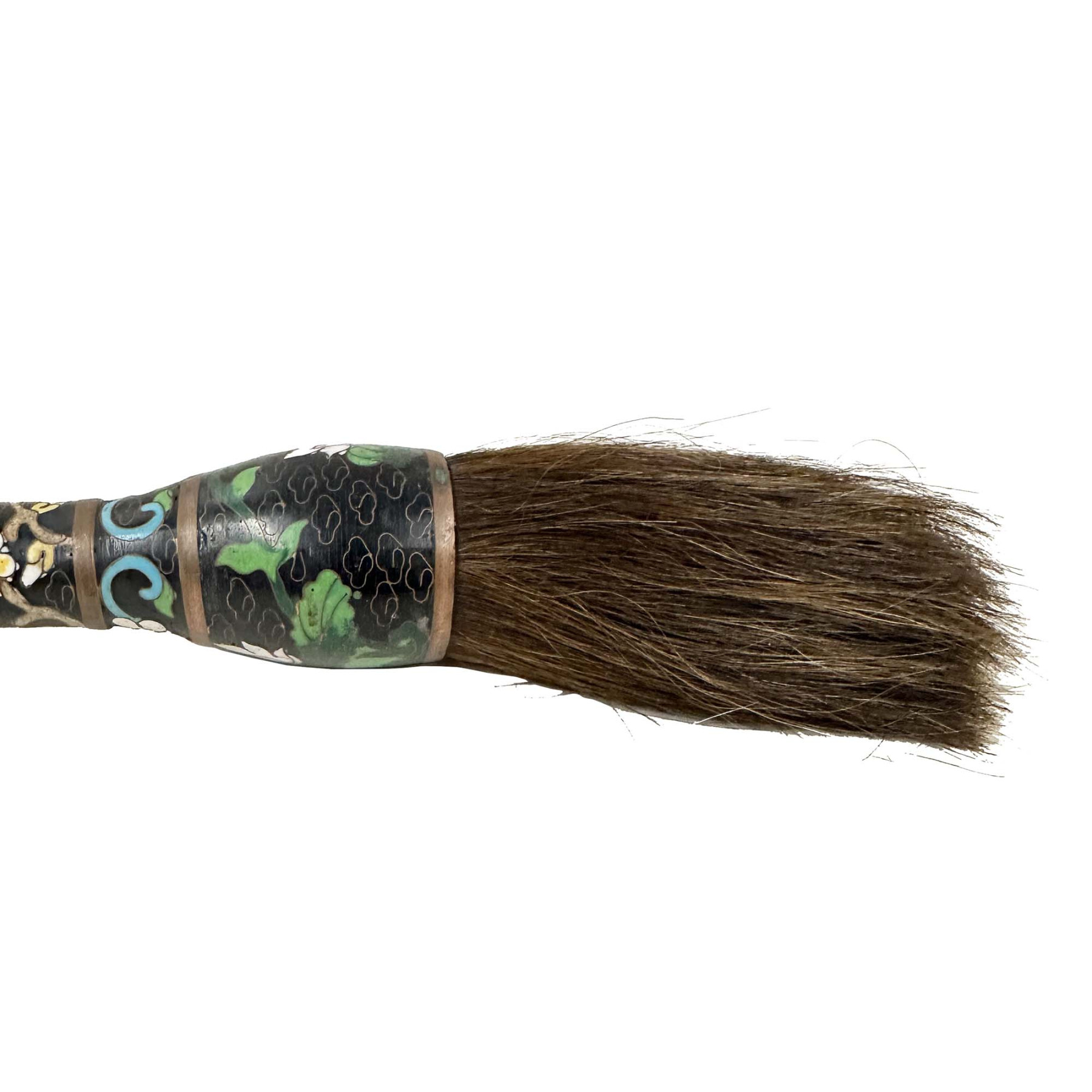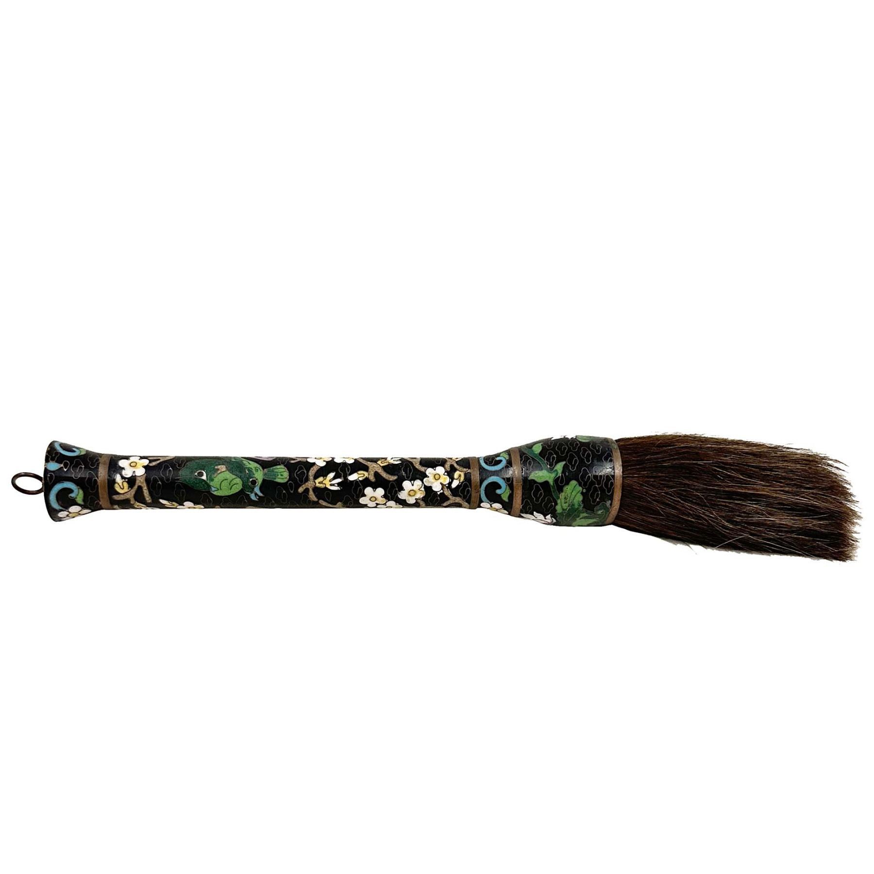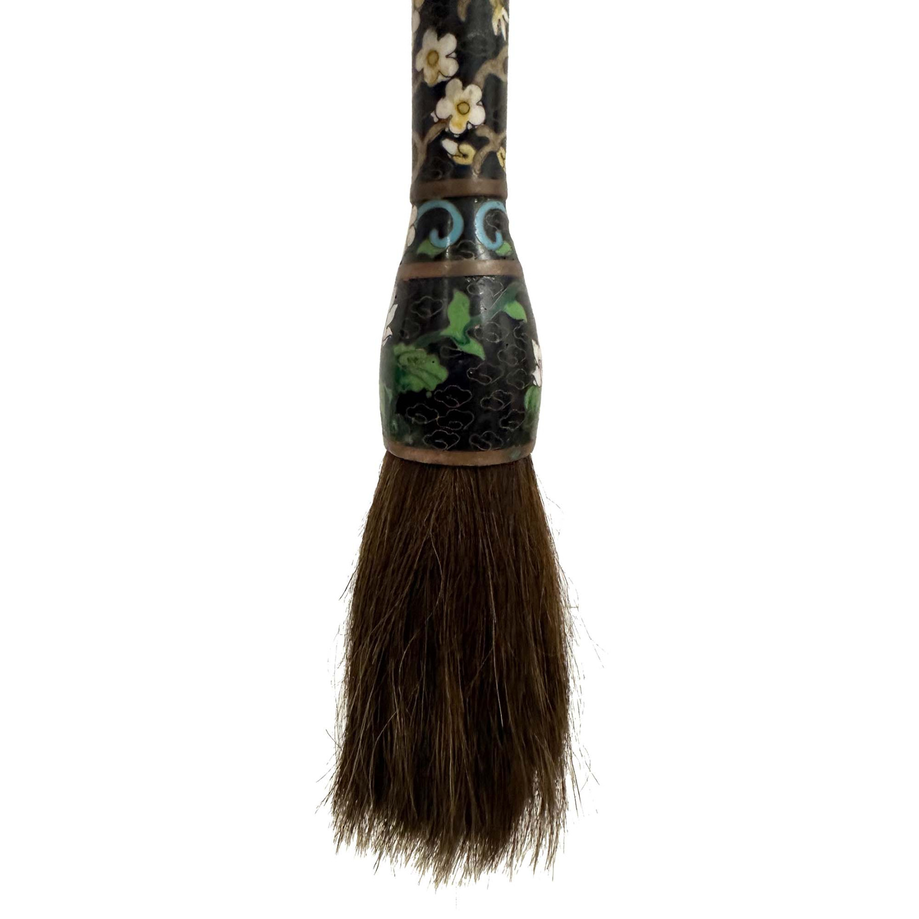 This is Chinese Calligraphy Brush, specifically featuring a cloisonné handle. The handle is crafted with cloisonné enamel, a decorative technique involving the fusion of colored glass pastes into compartments (cloisons) formed by wires on a metal base, resulting in intricate floral patterns as seen in the image. Used for traditional Chinese calligraphy and Sumi-e painting. In Chinese culture, the calligraphy brush is one of the "Four Treasures of the Study" (along with the inkstone, inkstick, and Xuan paper), essential tools for scholars and artists. The brush bristles are typically made from various animal hairs like goat, wolf, rabbit, or horsehair, chosen for their specific qualities suited for different artistic styles and techniques