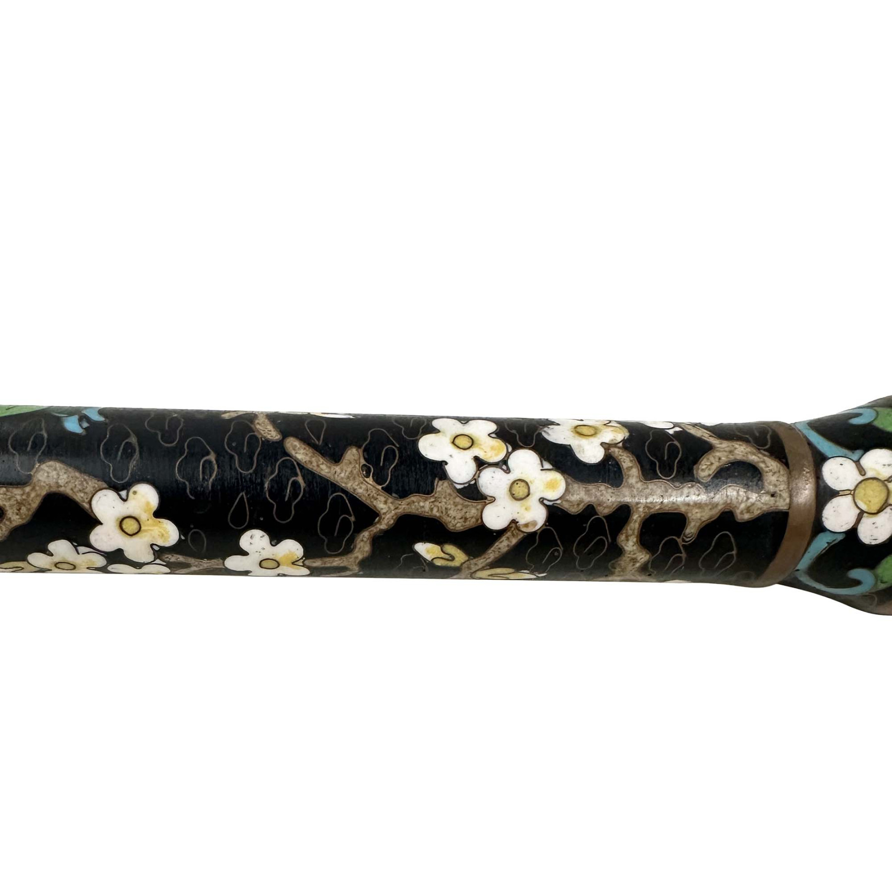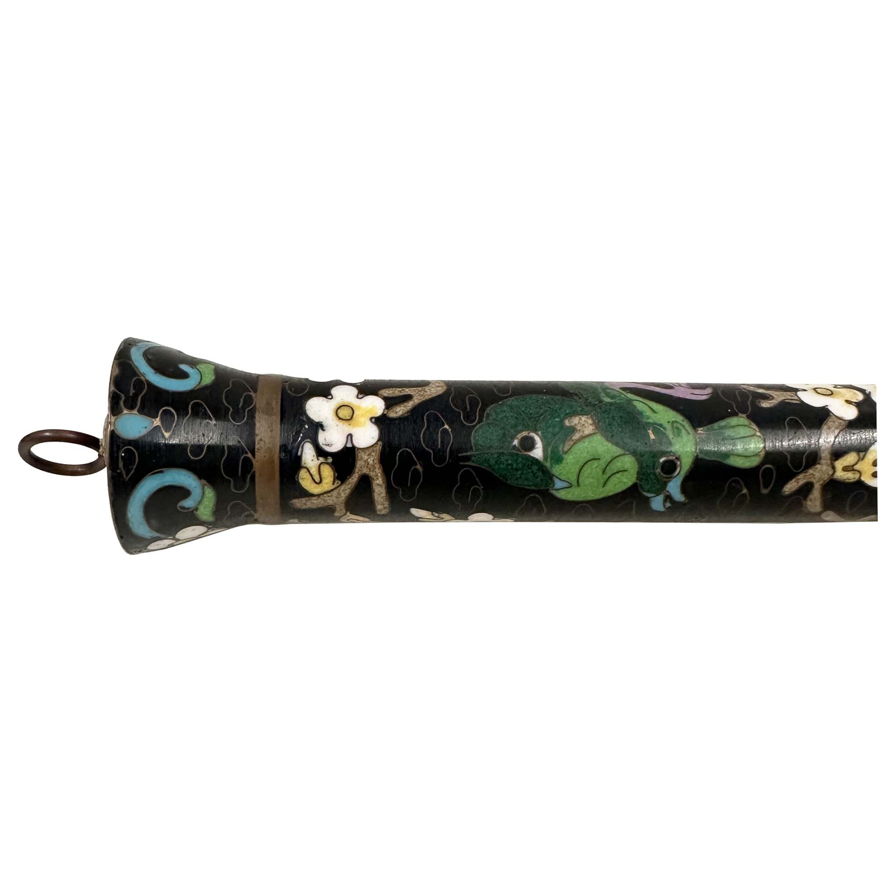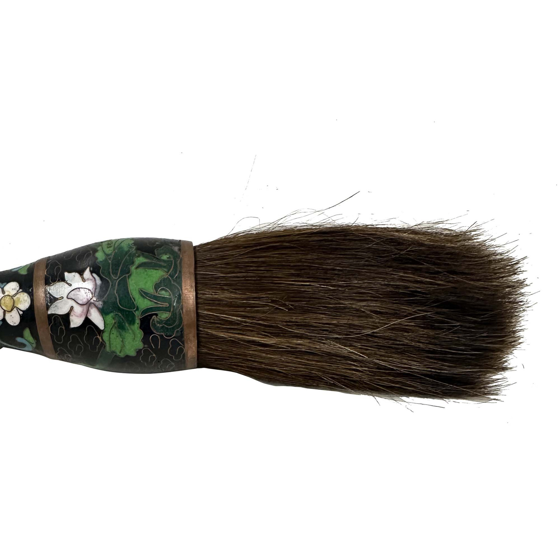 This is Chinese Calligraphy Brush, specifically featuring a cloisonné handle. The handle is crafted with cloisonné enamel, a decorative technique involving the fusion of colored glass pastes into compartments (cloisons) formed by wires on a metal base, resulting in intricate floral patterns as seen in the image. Used for traditional Chinese calligraphy and Sumi-e painting. In Chinese culture, the calligraphy brush is one of the "Four Treasures of the Study" (along with the inkstone, inkstick, and Xuan paper), essential tools for scholars and artists. The brush bristles are typically made from various animal hairs like goat, wolf, rabbit, or horsehair, chosen for their specific qualities suited for different artistic styles and techniques