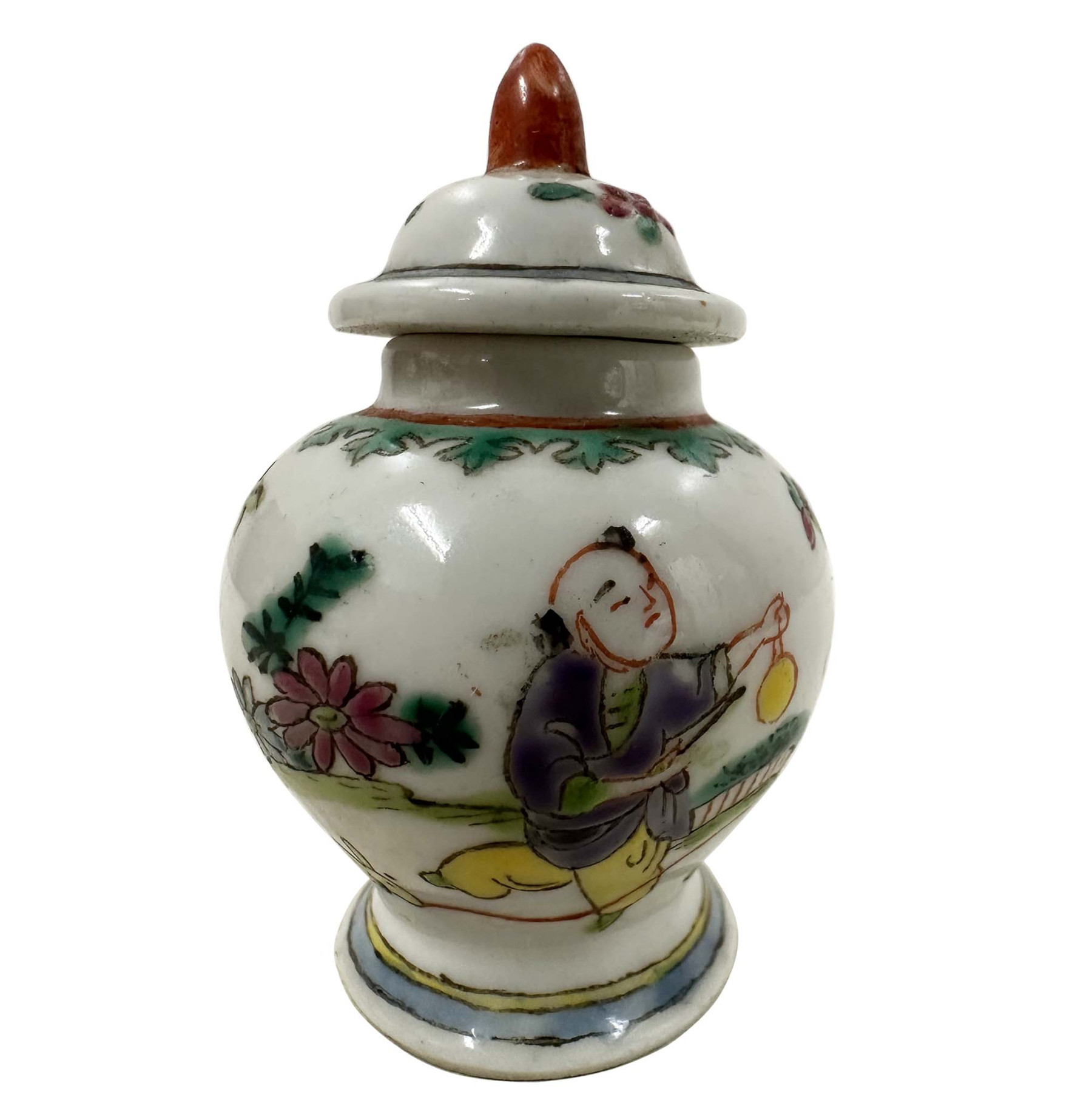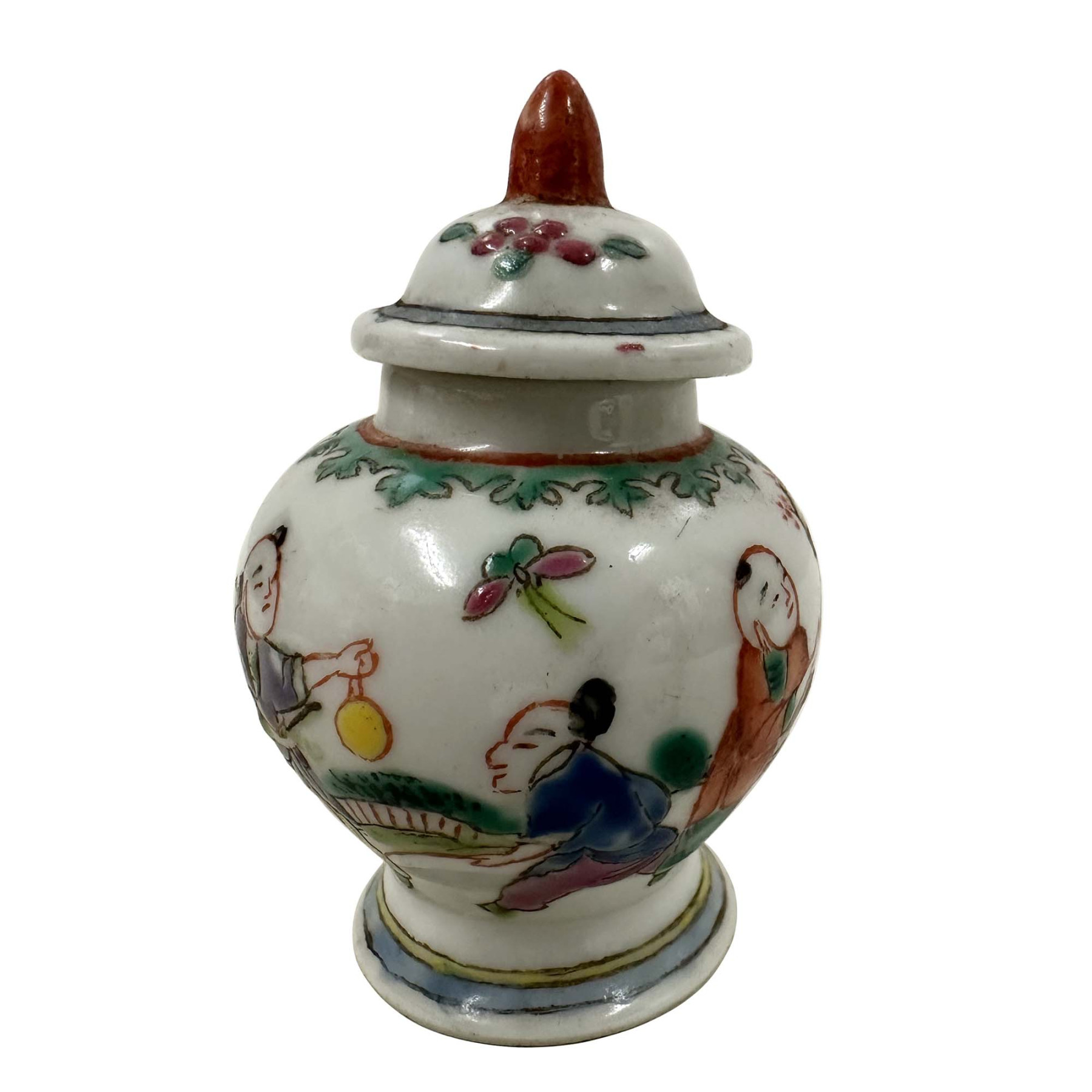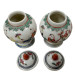 The jars are painted using the famille rose (French for "pink family") enamel technique, which typically includes prominent pink, green, yellow, and blue colors. The hand-painted scenes feature human figures in traditional Chinese clothing engaged in activities, often referred to as a "boys at play"