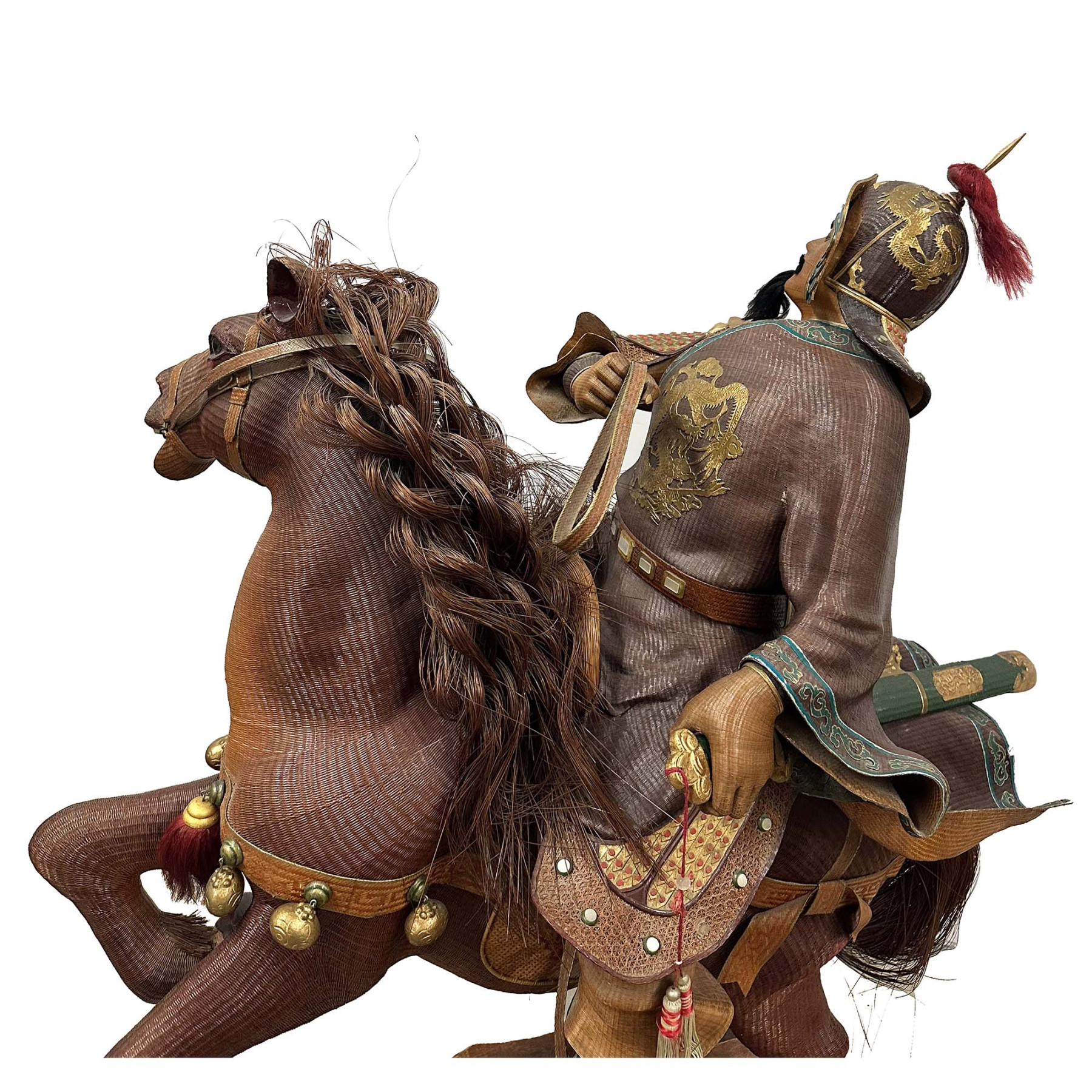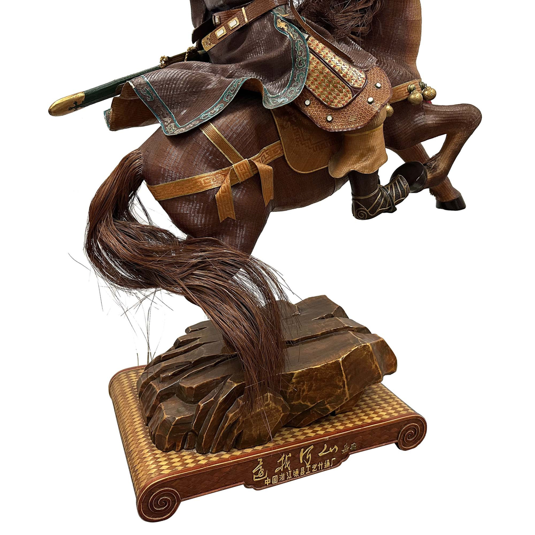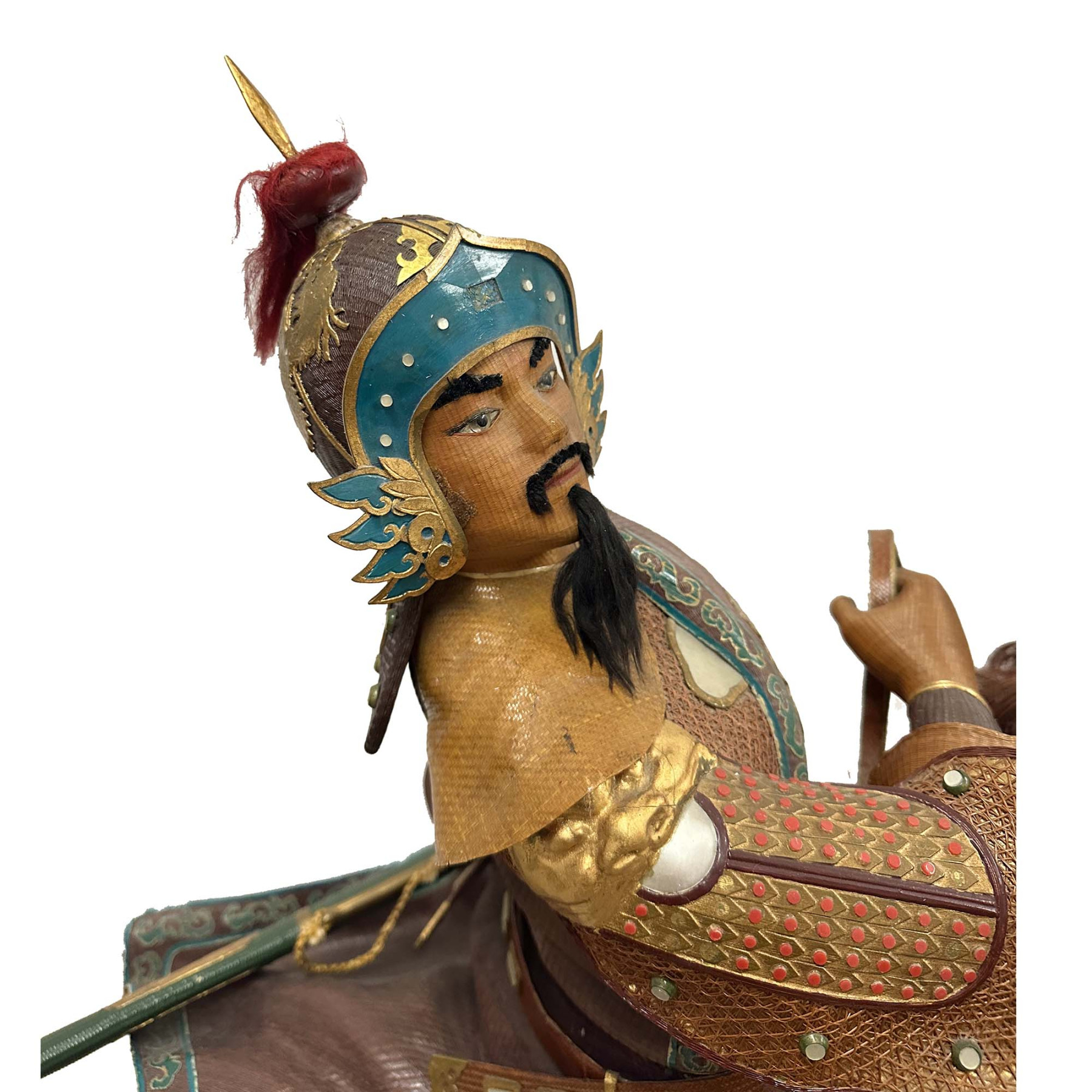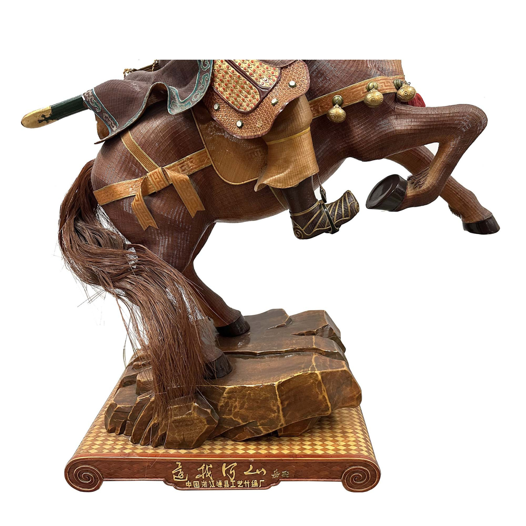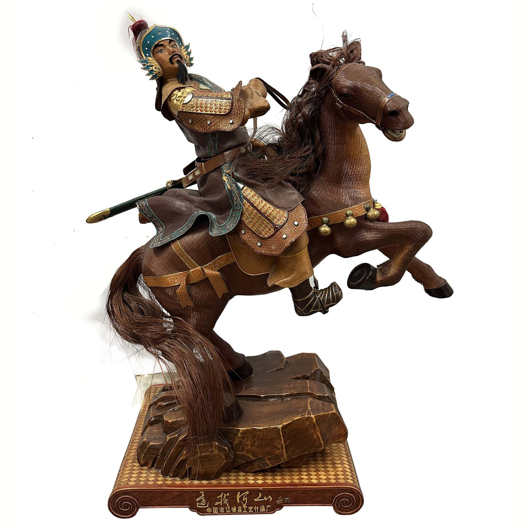 This is a hand-crafted Bamboo-woven Statue of Yue Fei. Yue Fei was a Chinese military general of the Song dynasty and is remembered as a patriotic national hero, known for leading its forces in the wars in the 12th century between Southern Song and the Jurchen-led Jin dynasty in northern China. Because of his warlike stance, he was put to death by the Southern Song government in 1142 under a frame-up, after a negotiated peace was achieved with the Jin dynasty. He was posthumously pardoned.