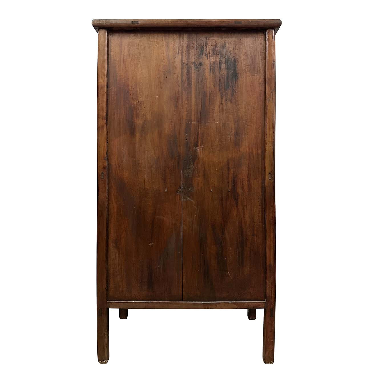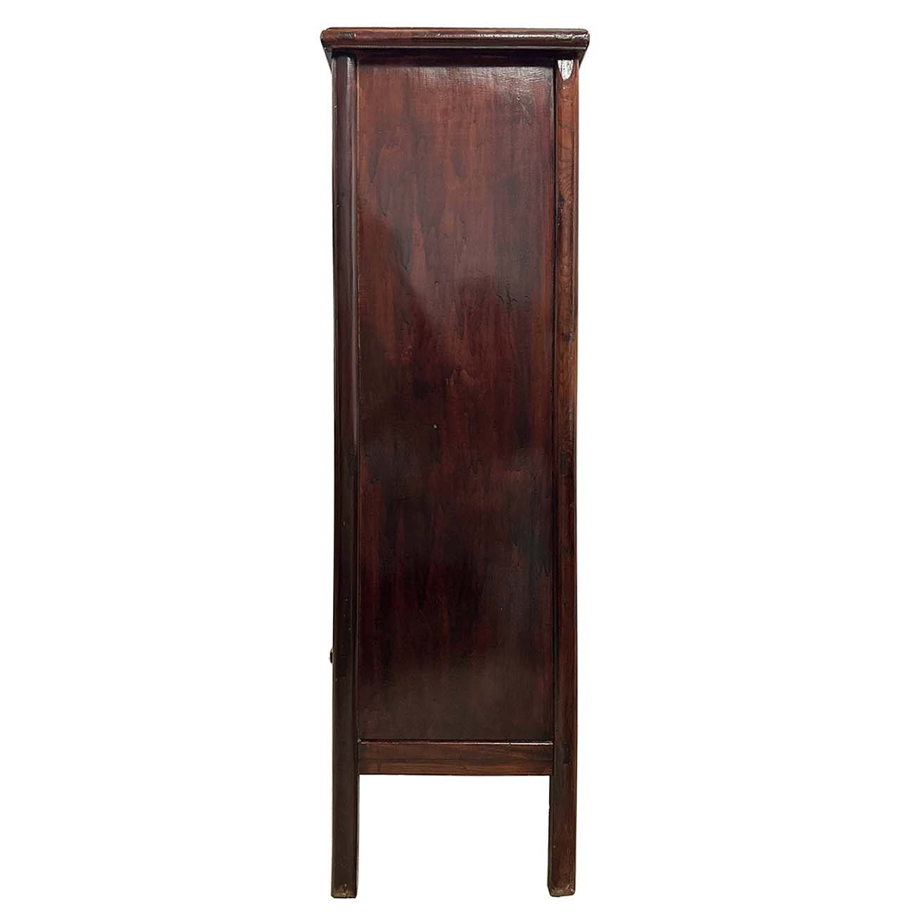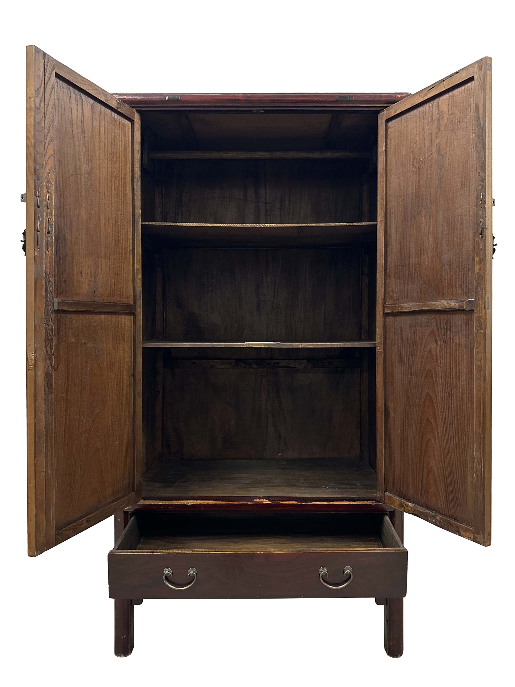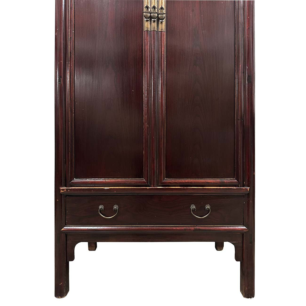 This beautiful Chinese antique carved round corner Armoire/Noodle cabinet features large copper hardware on the front doors with beautiful carving works on it. Both sides and back are finished. This armoire made at about 1890's using solid elm wood with dark mahogany lacquered finished. There are two removable/adjustable shelf inside cabinet and two drawers with antique hardware outside cabinet. On the outside bottom of the armoire, there are some traditional Chinese wood works on it to support the legs. This armoire has round corner and edge and simple plain design which is the Ming style. It is very sturdy. You can easily see from the pictures that some of the age wear but it shows you the beautiful patina.