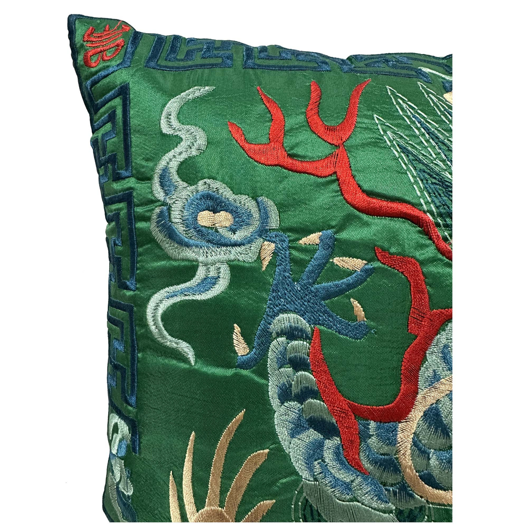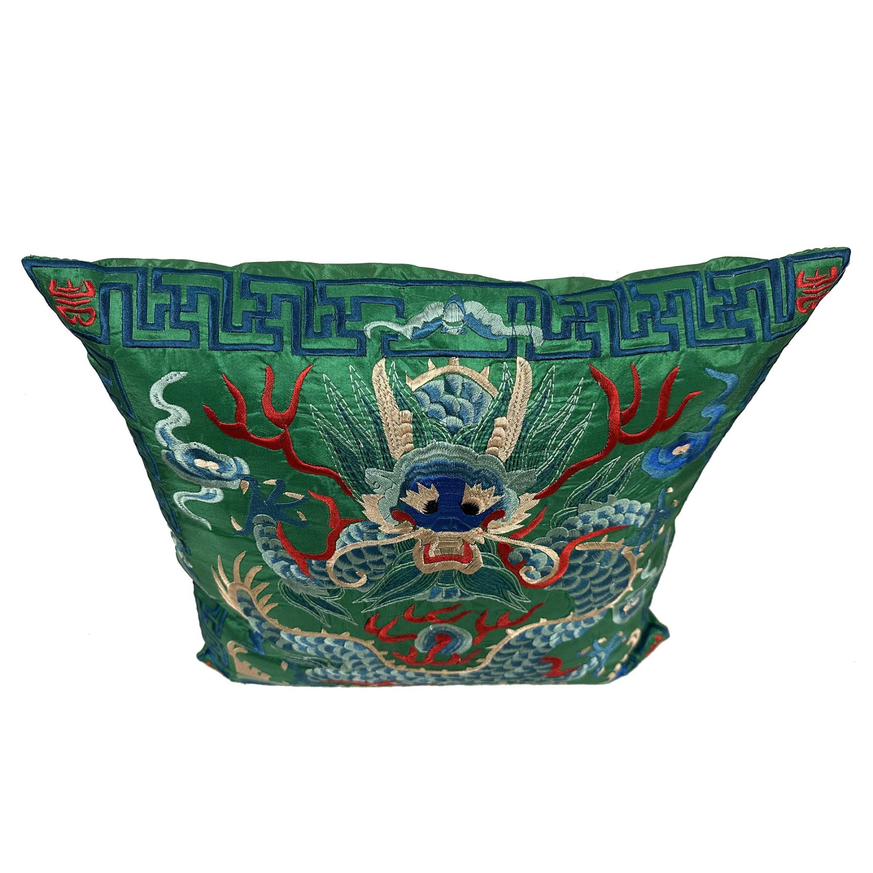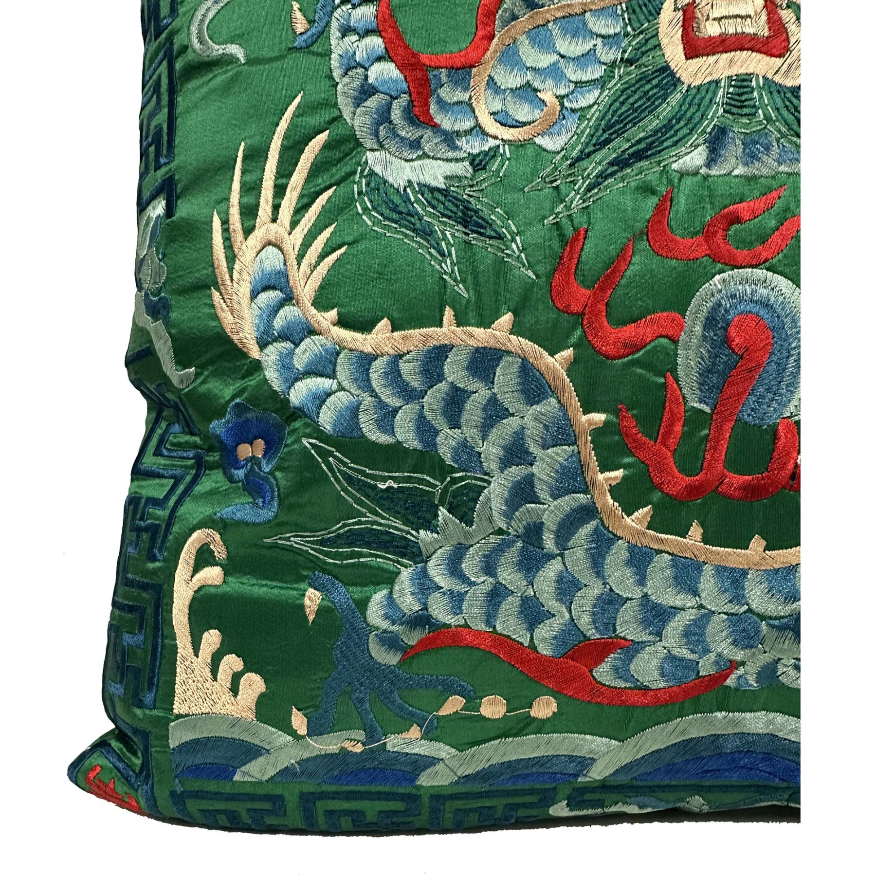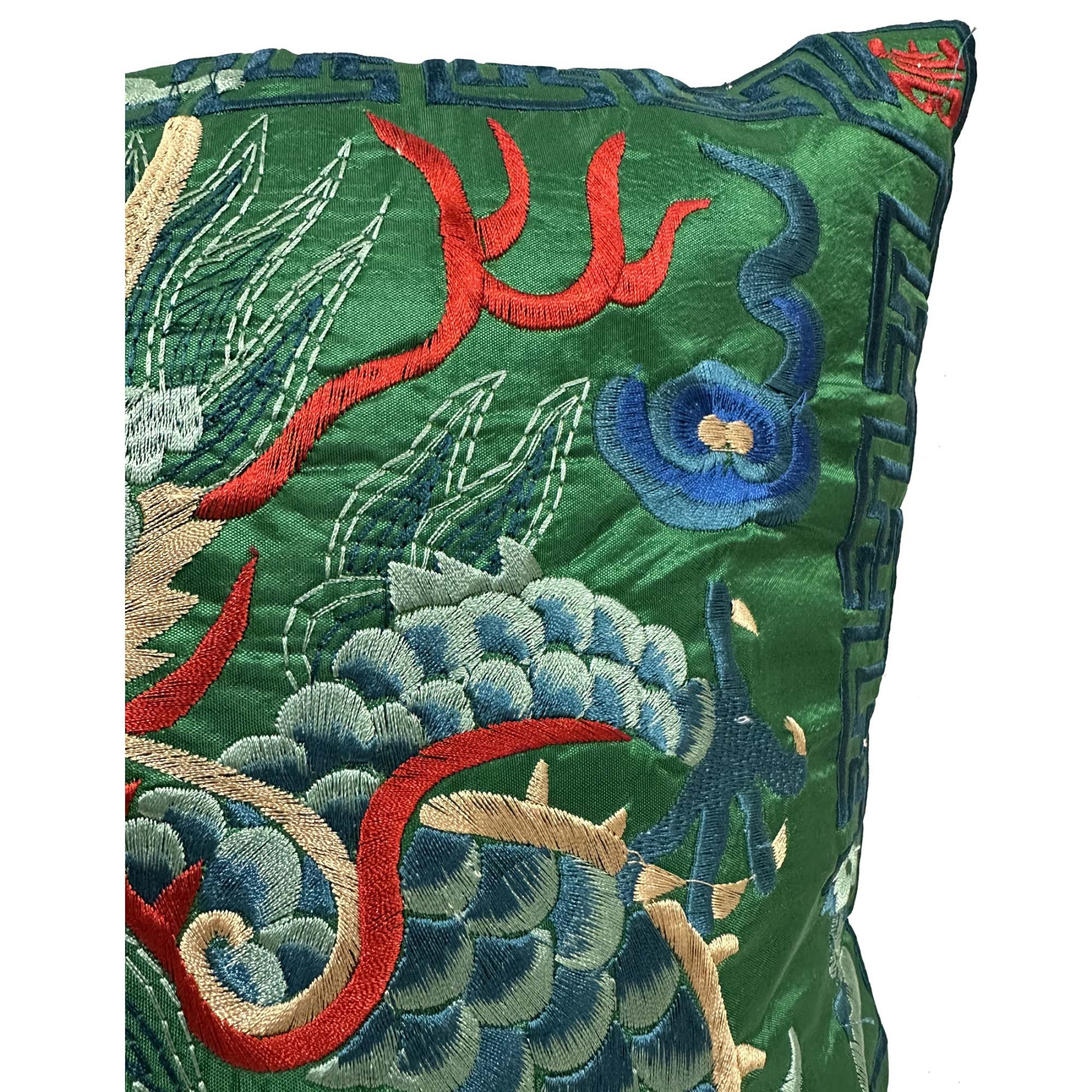 The pillow has intricate detailing, with bold colors such as red, gold, and green, which are commonly associated with prosperity, wealth, and harmony. The silk fabric provides a luxurious sheen, enhancing the vibrancy of the colors and the fine craftsmanship of the embroidery. The dragon motifs, especially with their imperial associations, would be intricately woven to show swirling clouds or flames, adding dynamic movement to the design.