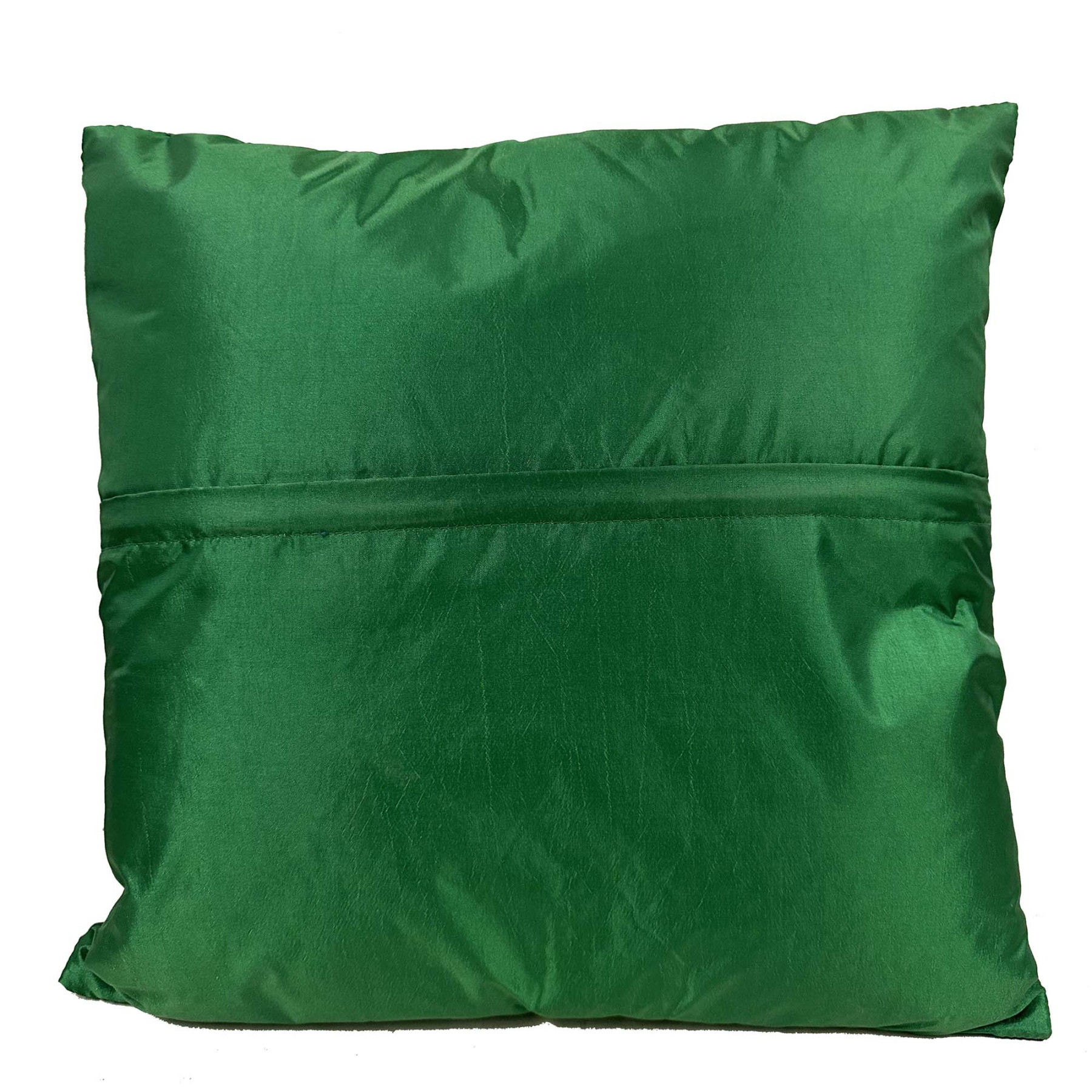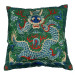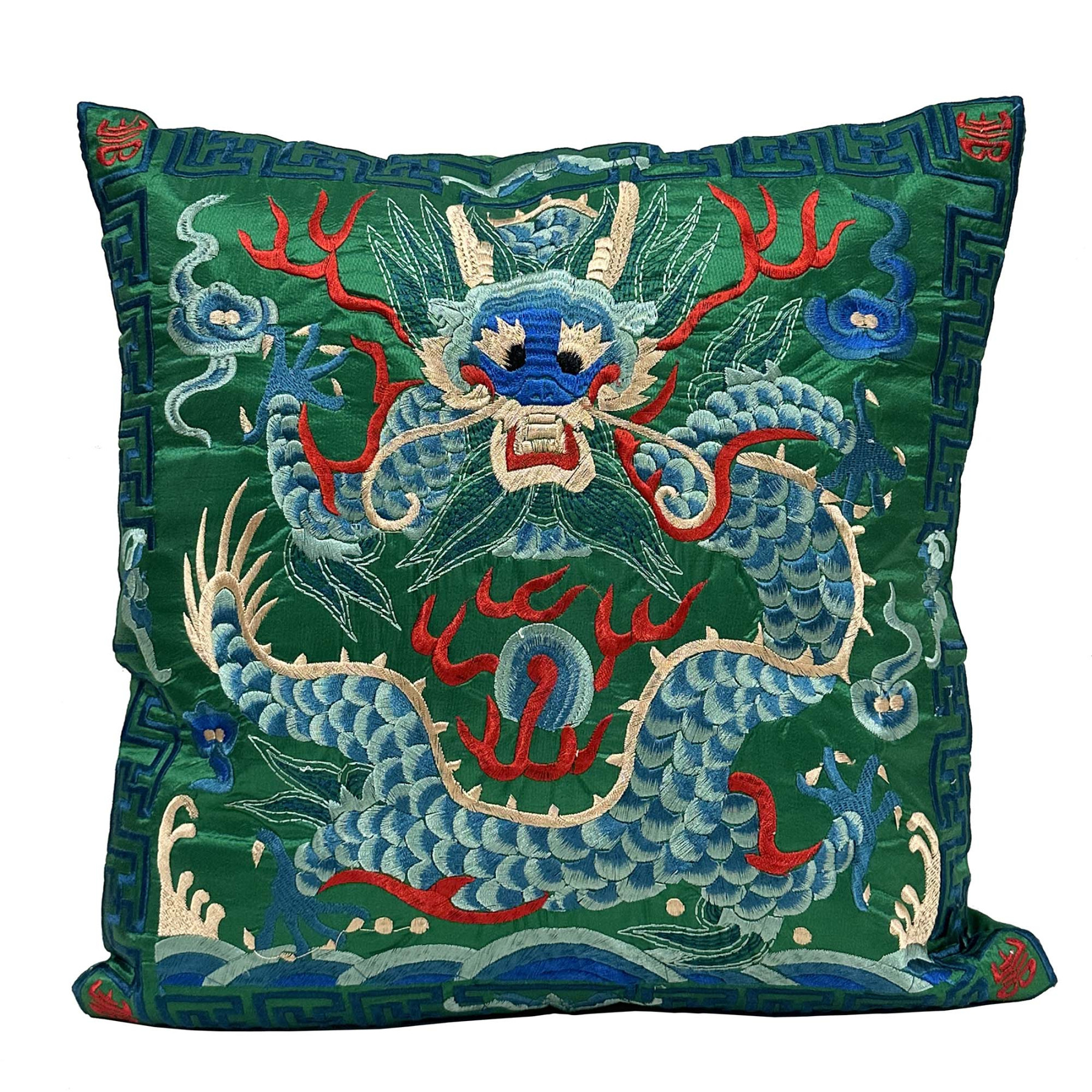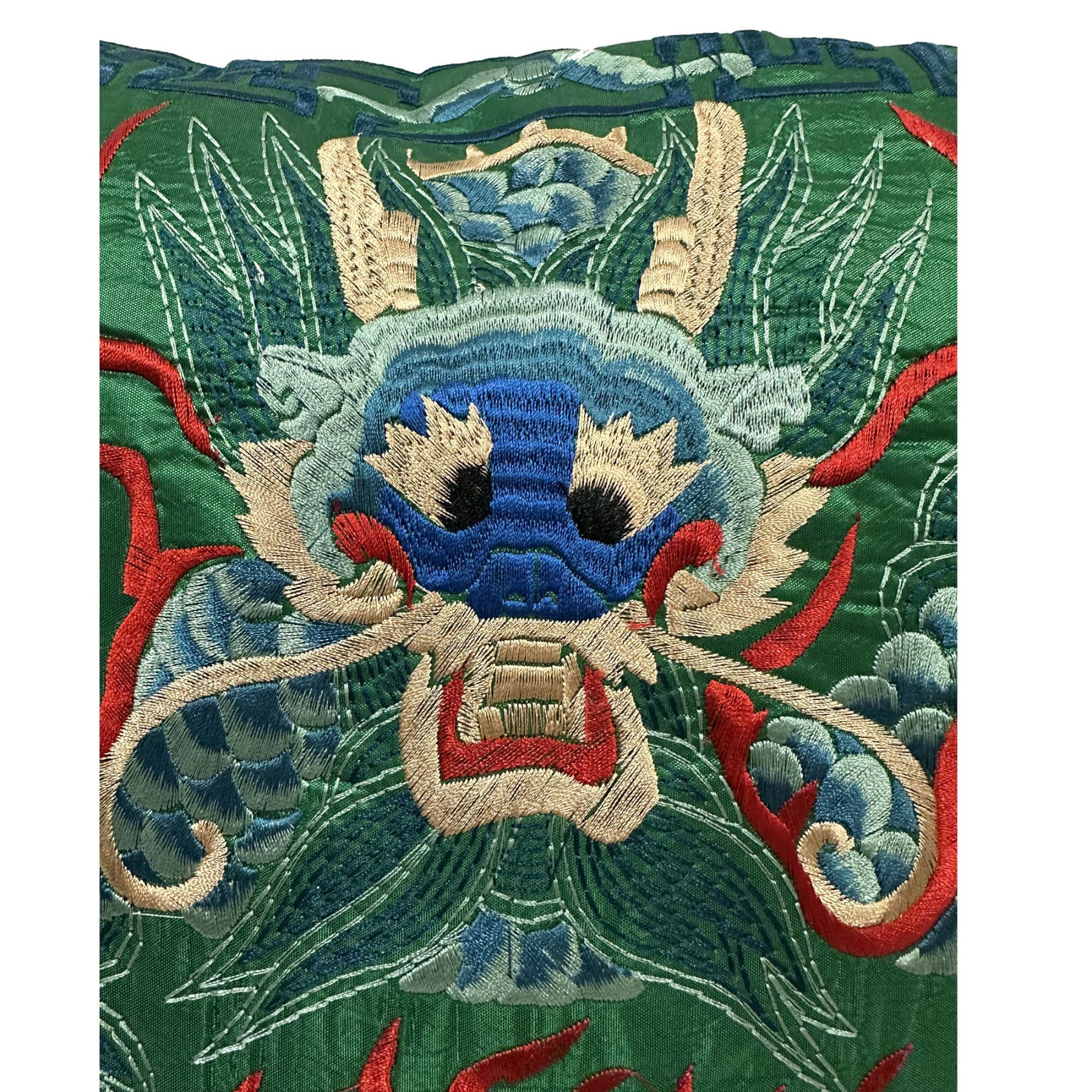 The pillow has intricate detailing, with bold colors such as red, gold, and green, which are commonly associated with prosperity, wealth, and harmony. The silk fabric provides a luxurious sheen, enhancing the vibrancy of the colors and the fine craftsmanship of the embroidery. The dragon motifs, especially with their imperial associations, would be intricately woven to show swirling clouds or flames, adding dynamic movement to the design.