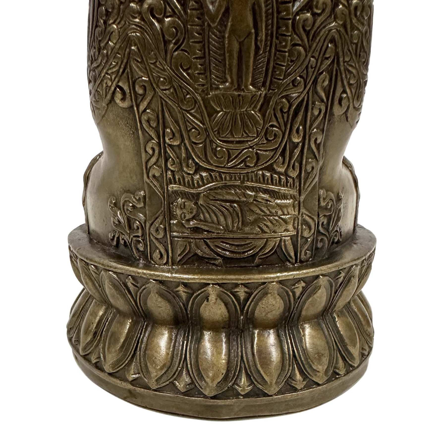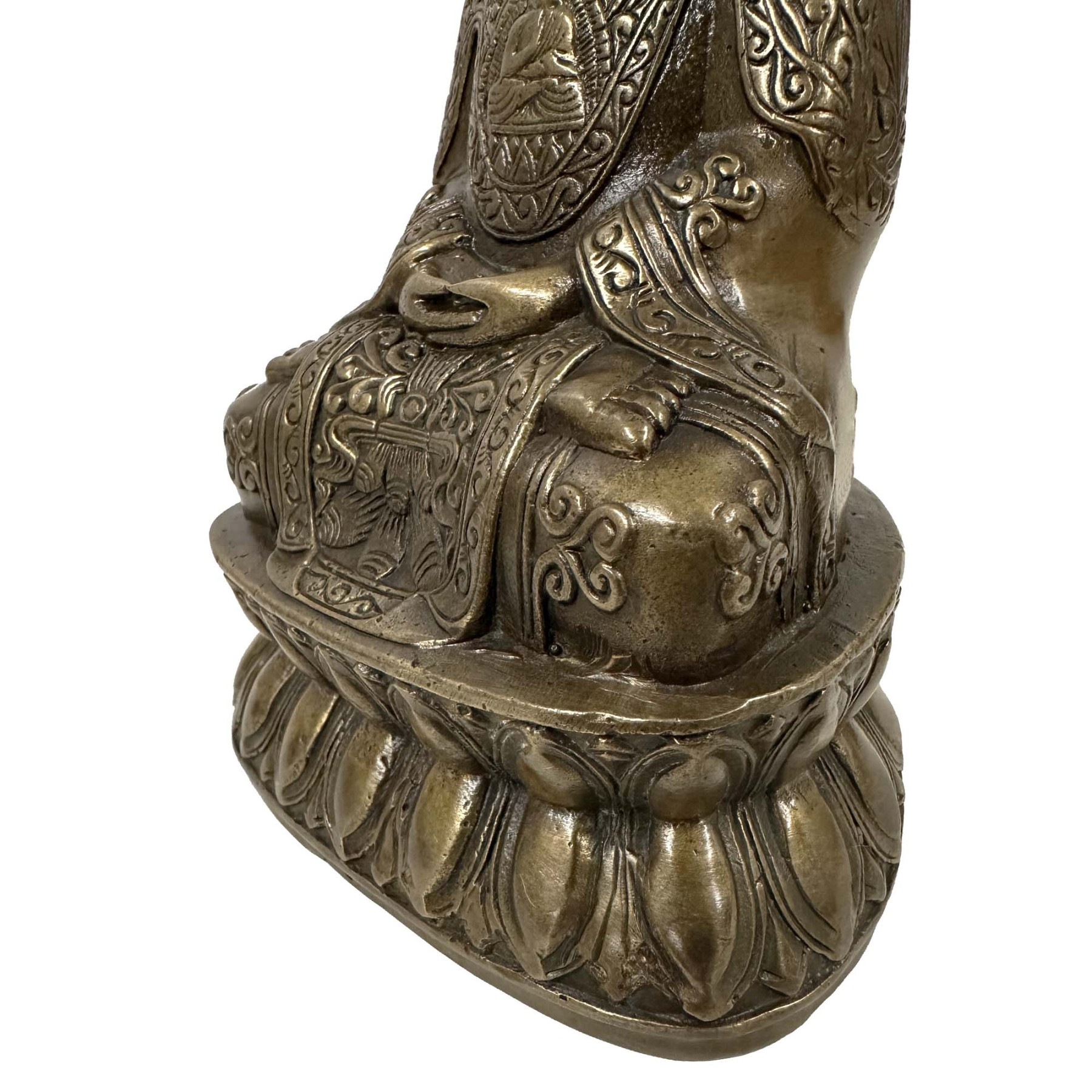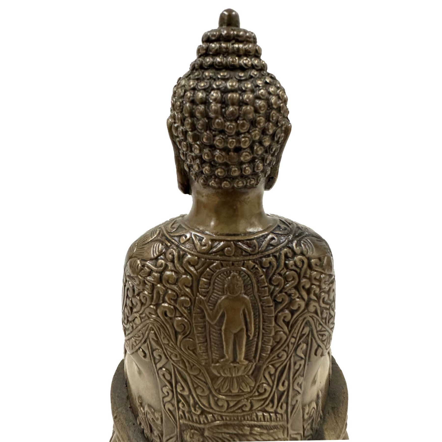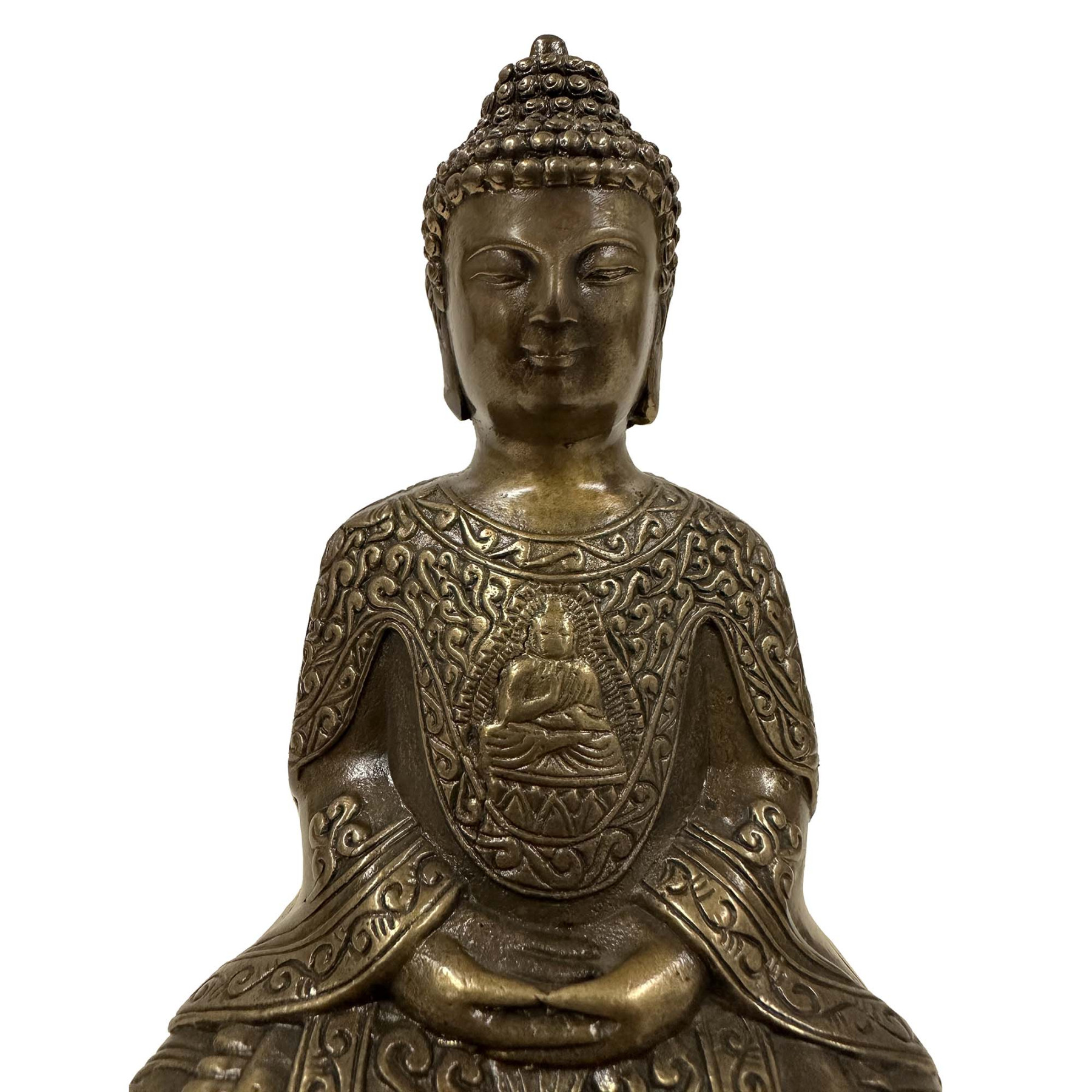 The statue is crafted from cast bronze. The robe is heavily engraved with patterns, including a smaller Buddha figure on the chest. You can see from the pictures that they are in many years history with some age wears. Now you can have them on your collection shelf.