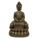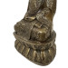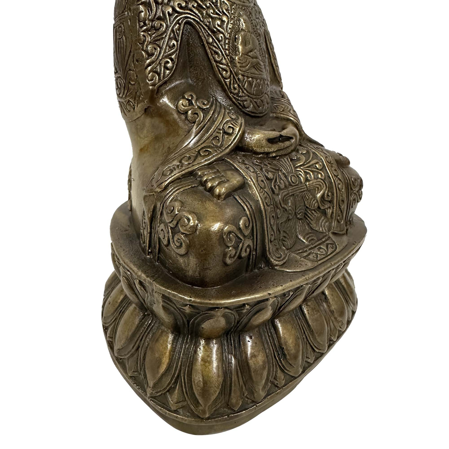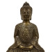 This image shows a bronze-cast Buddha statue, likely depicting Shakyamuni or Amitabha Buddha. The figure is seated in a meditative pose on an ornate double lotus base, with hands resting in the Dhyana Mudra (meditation gesture).