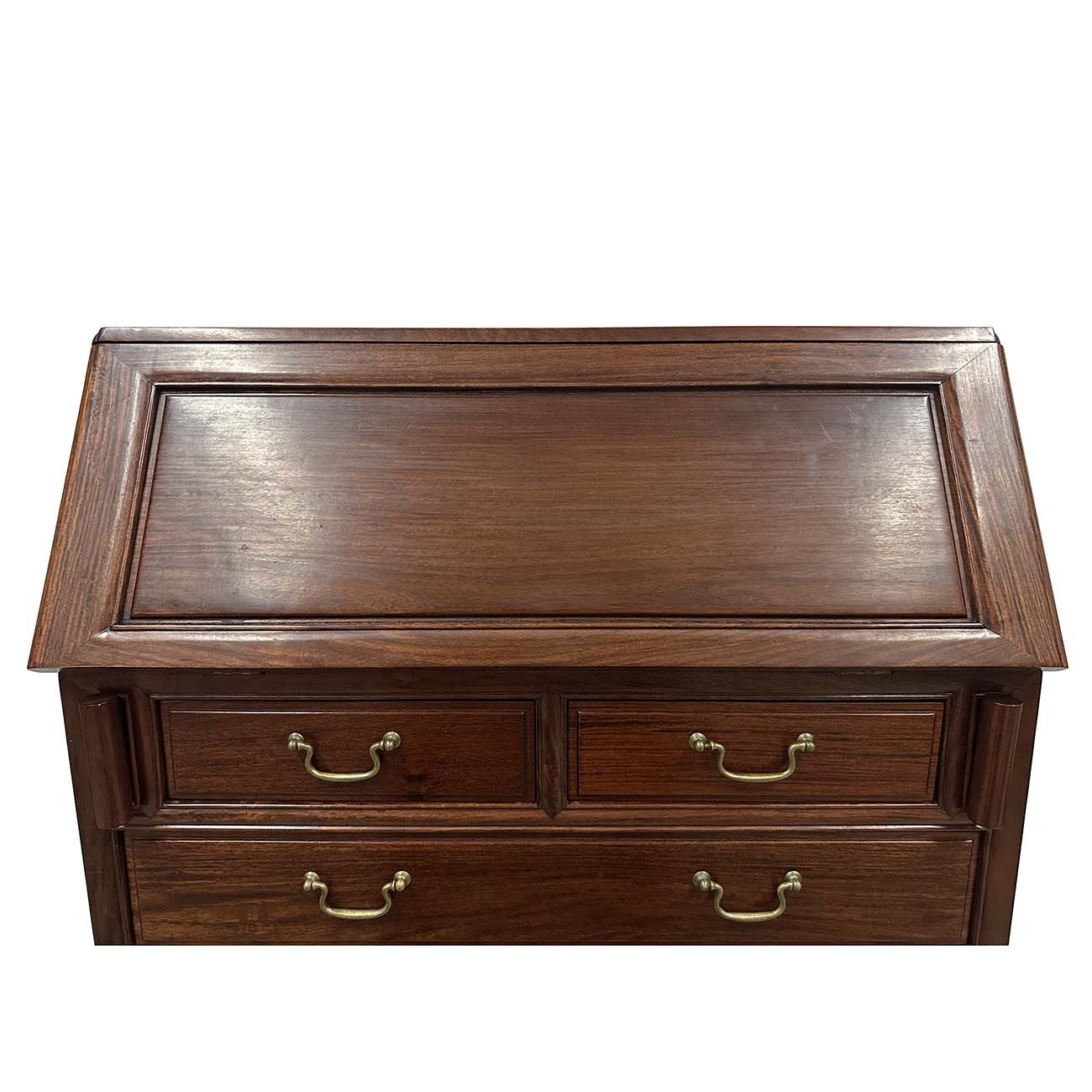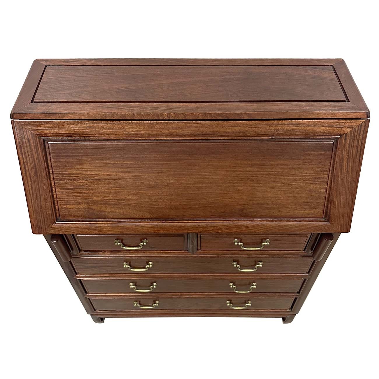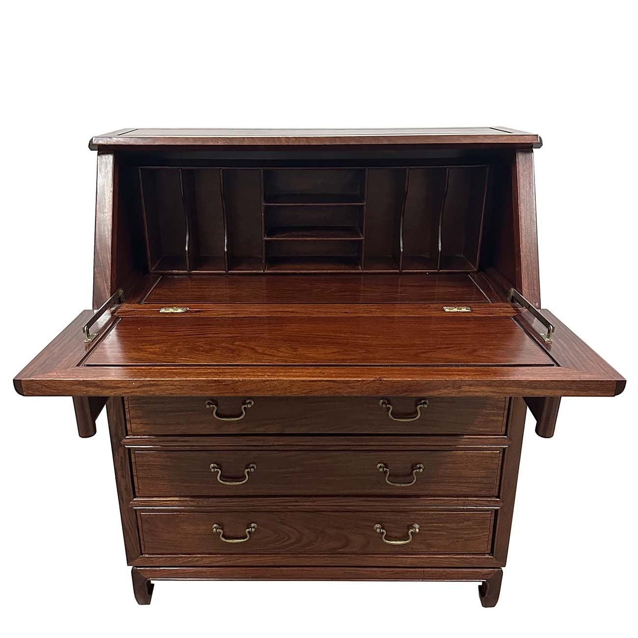 This beautiful carved secretary/writing desk is in traditional design with 5 drawers and fold up desk top on the front and wonderful simple carving works around the desk. It was made from solid rosewood, very smooth and hard furniture wood in about 1950's with natural finished. It has 5 drawers outside and 3 file sections inside folding desk top. . You can easily see from the pictures that some of the age wear but it shows you the beautiful patina. This stunning antique piece reflect the traditional furniture art of China.