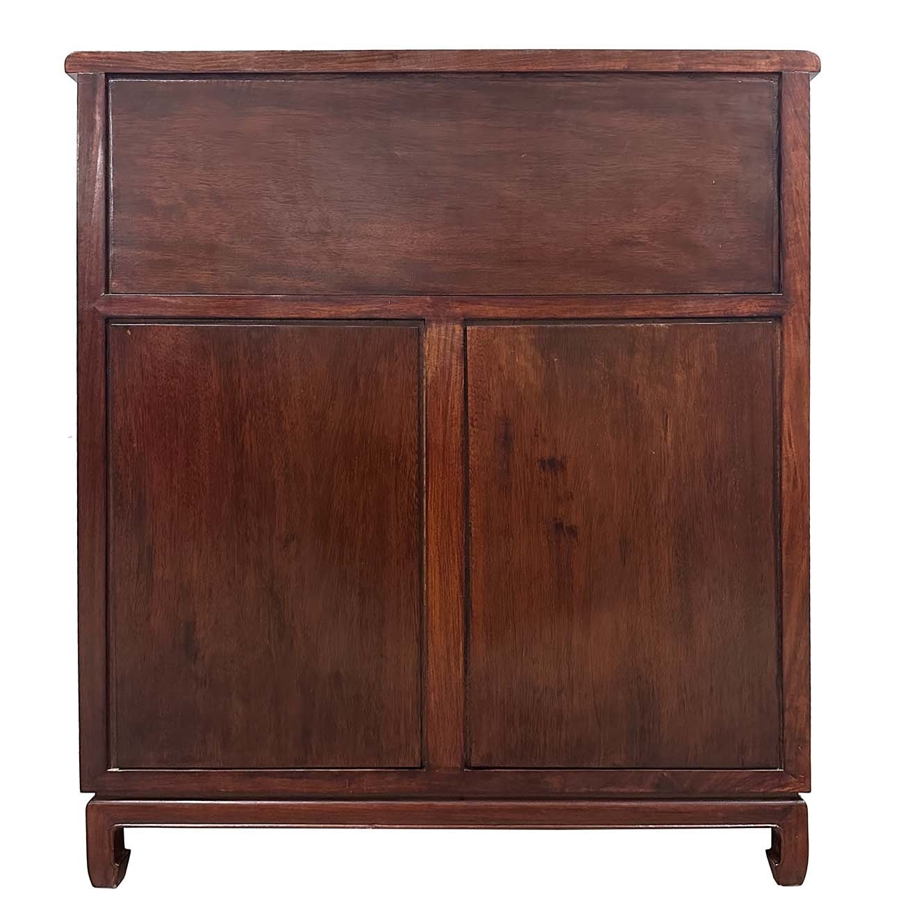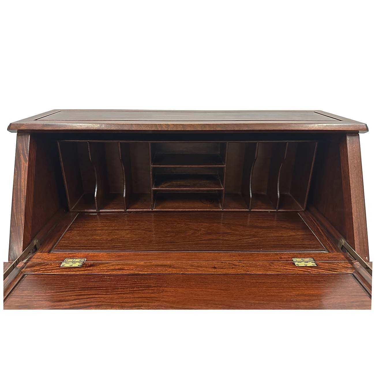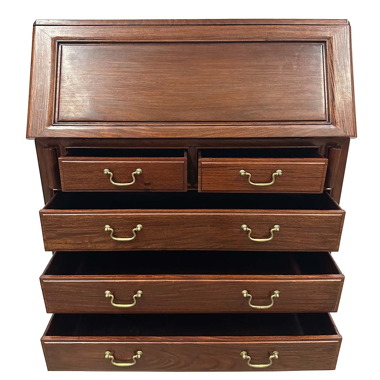 This beautiful carved secretary/writing desk is in traditional design with 5 drawers and fold up desk top on the front and wonderful simple carving works around the desk. It was made from solid rosewood, very smooth and hard furniture wood in about 1950's with natural finished. It has 5 drawers outside and 3 file sections inside folding desk top. . You can easily see from the pictures that some of the age wear but it shows you the beautiful patina. This stunning antique piece reflect the traditional furniture art of China.
