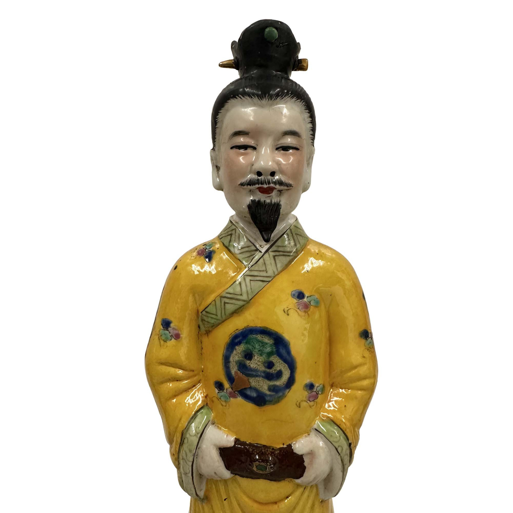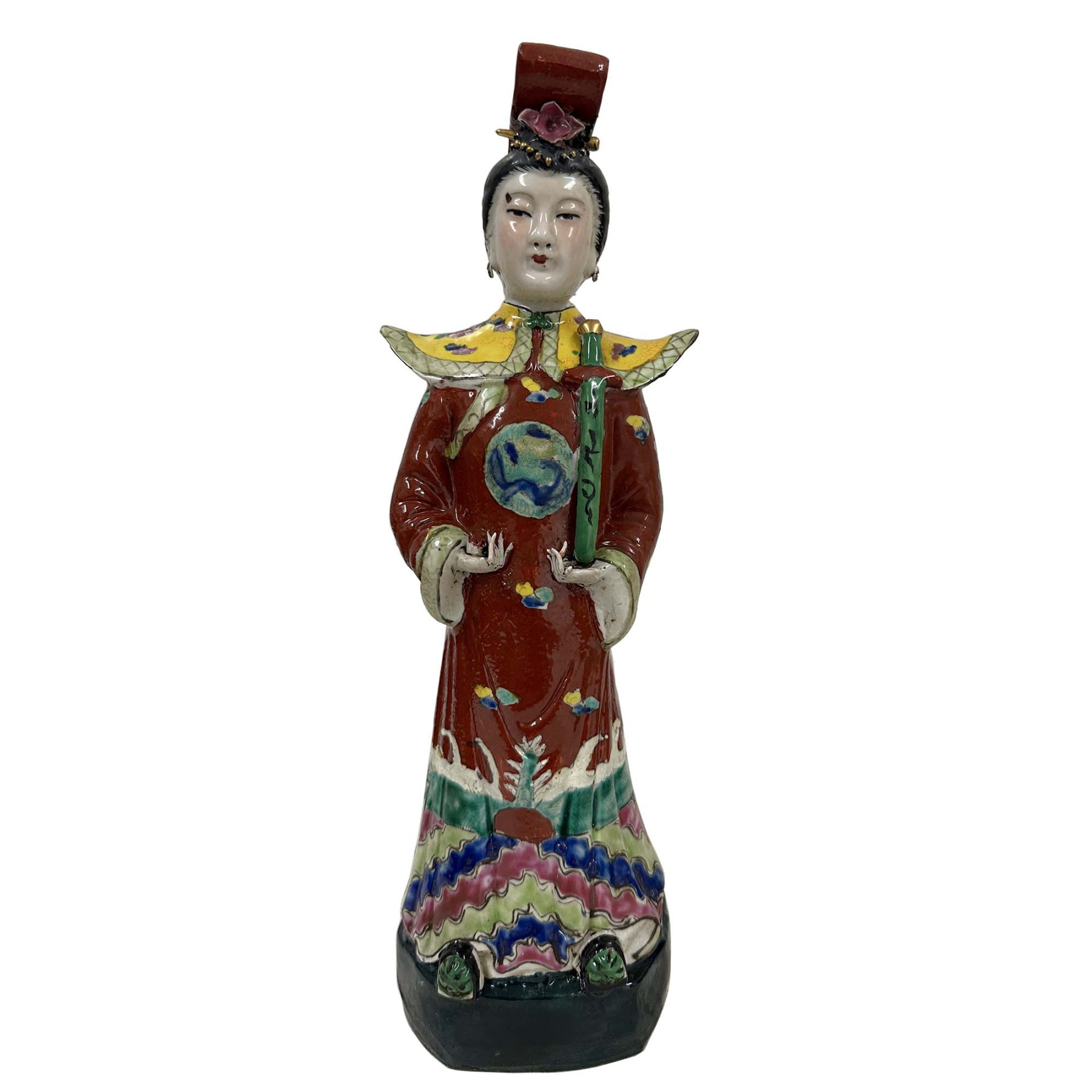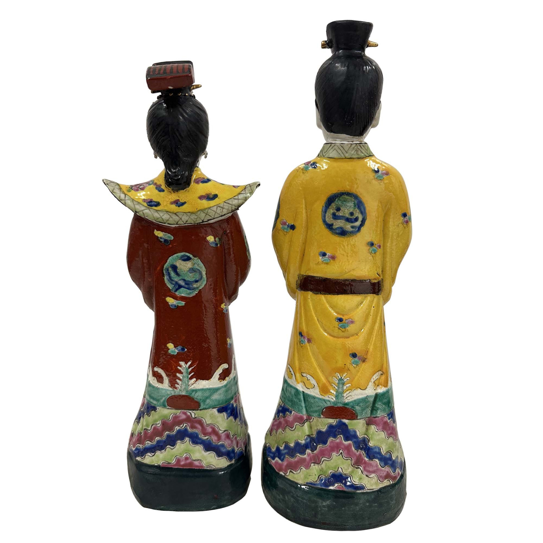 This pair of figurines represents Chinese Emperor and empress from the Qing Dynasty, These hand-painted porcelain statues are typically crafted in the Wucai (five-color) style, featuring vibrant enamels and intricate imperial symbols. Each statue has beautiful detailed carving works and shows the King and queen in their emperor dressing. The figure wears a traditional formal yellow robe, a color historically reserved for the Emperor, decorated with auspicious symbols like dragons and clouds. They are in very good vintage condition with some age wear.