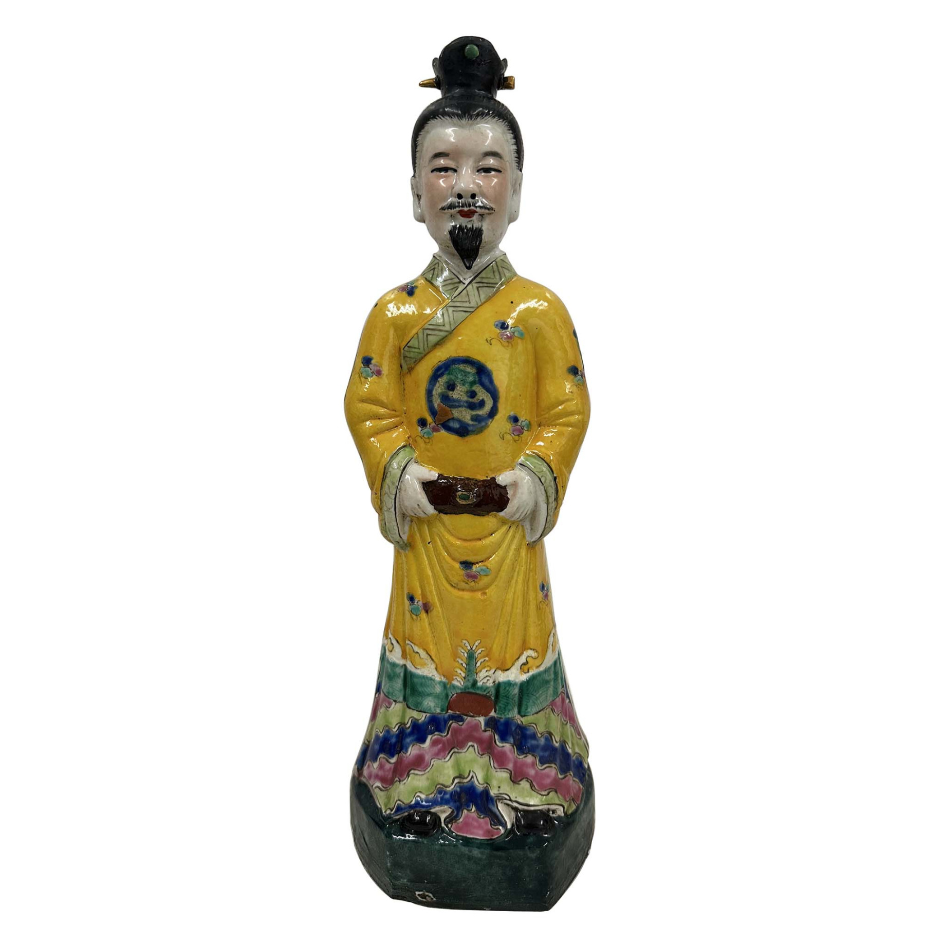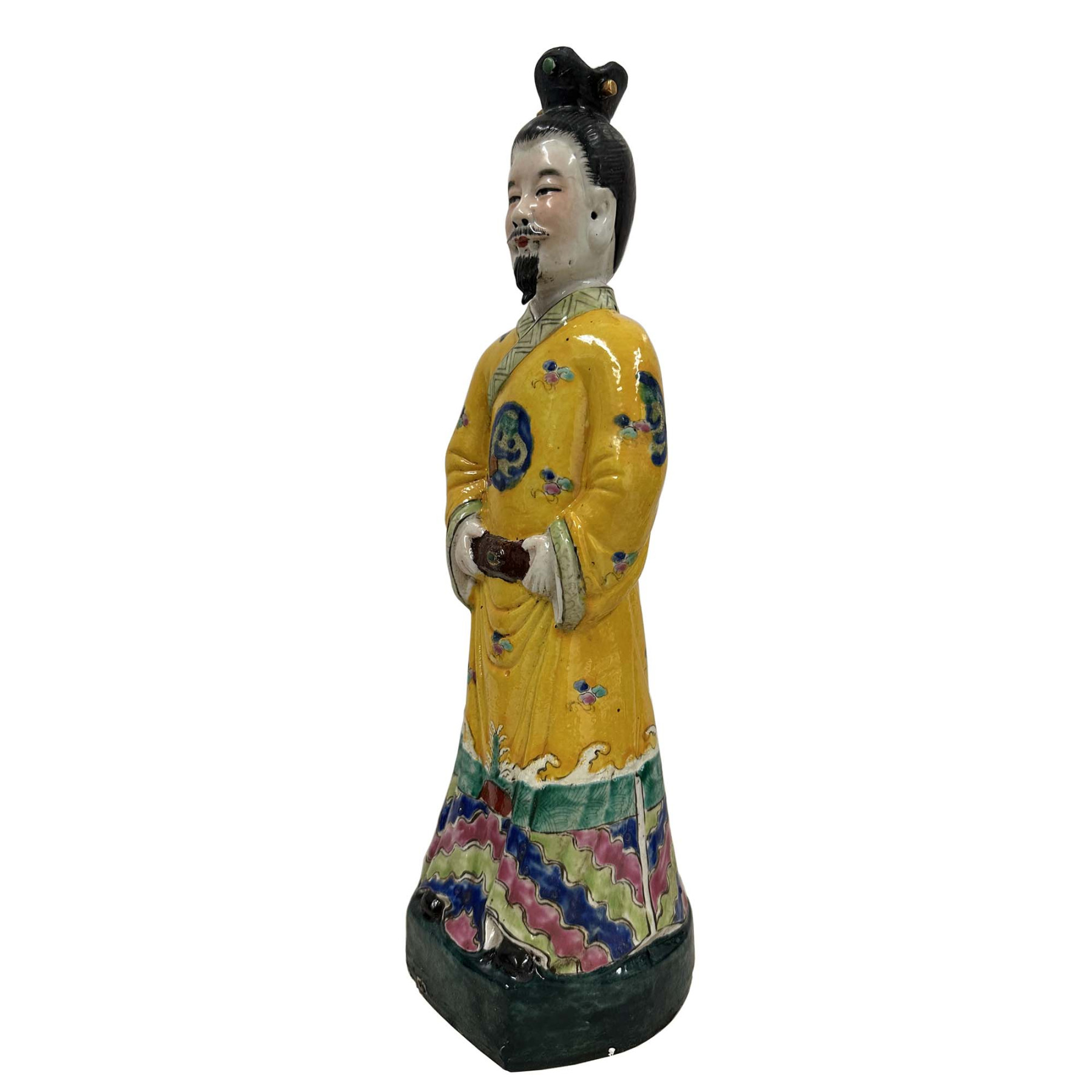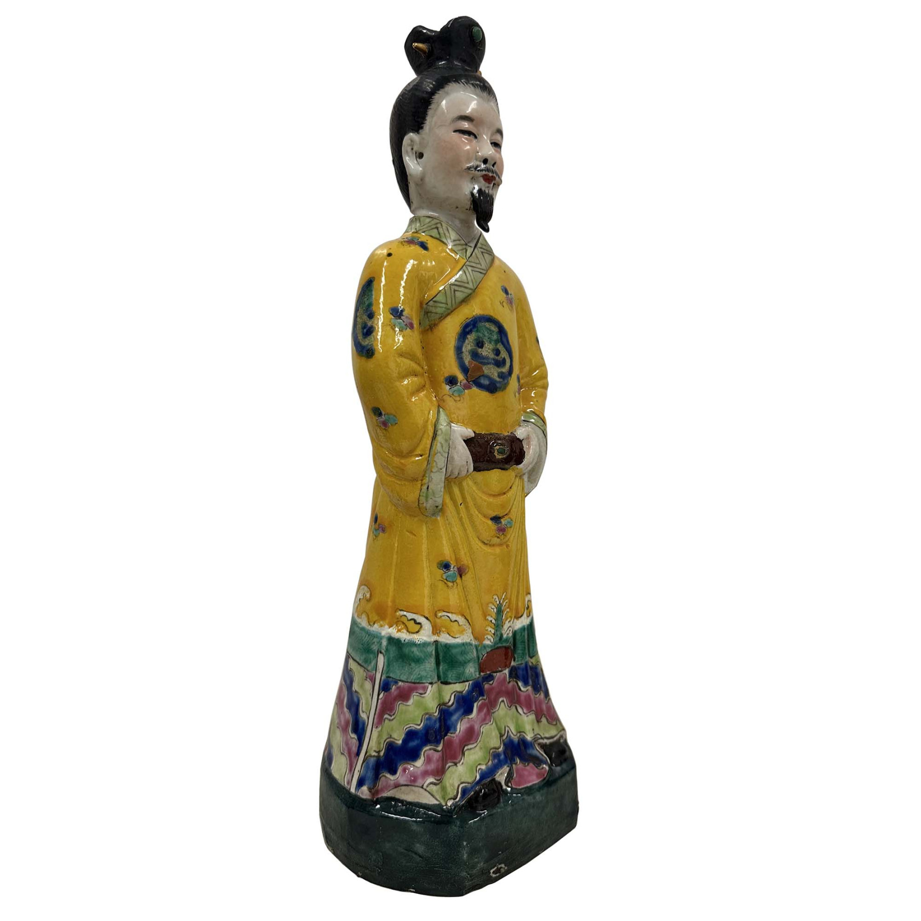 This pair of figurines represents Chinese Emperor and empress from the Qing Dynasty, These hand-painted porcelain statues are typically crafted in the Wucai (five-color) style, featuring vibrant enamels and intricate imperial symbols. Each statue has beautiful detailed carving works and shows the King and queen in their emperor dressing. The figure wears a traditional formal yellow robe, a color historically reserved for the Emperor, decorated with auspicious symbols like dragons and clouds. They are in very good vintage condition with some age wear.