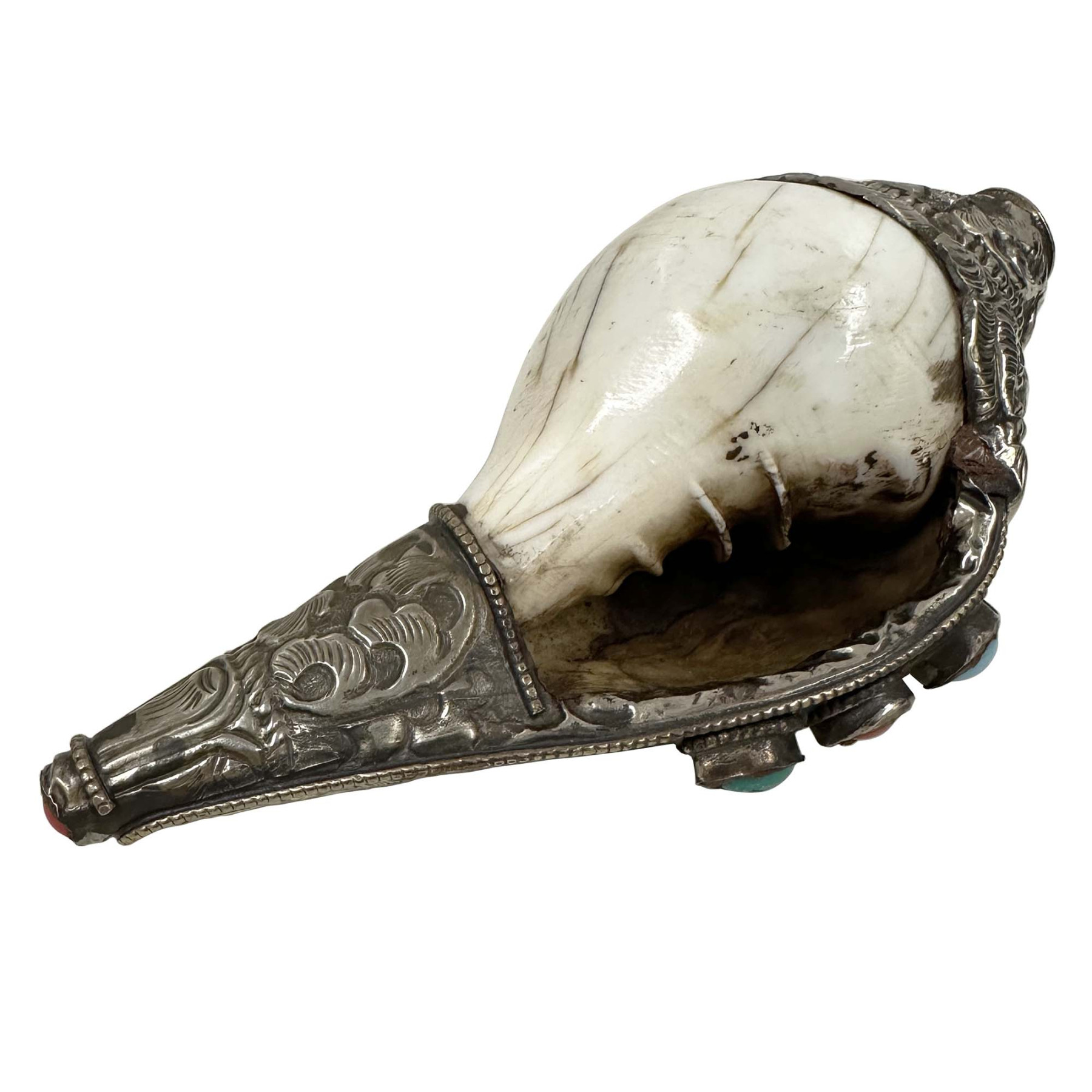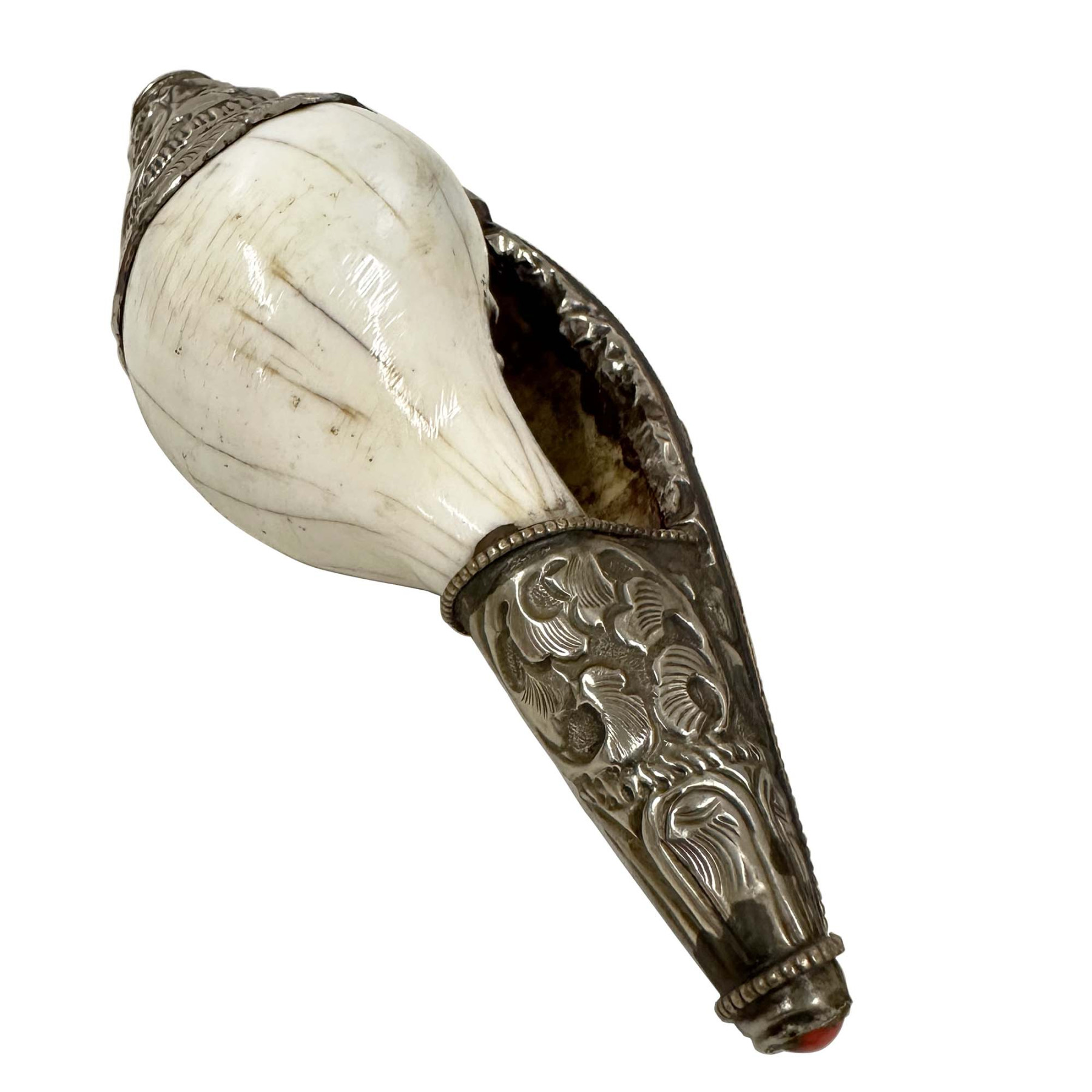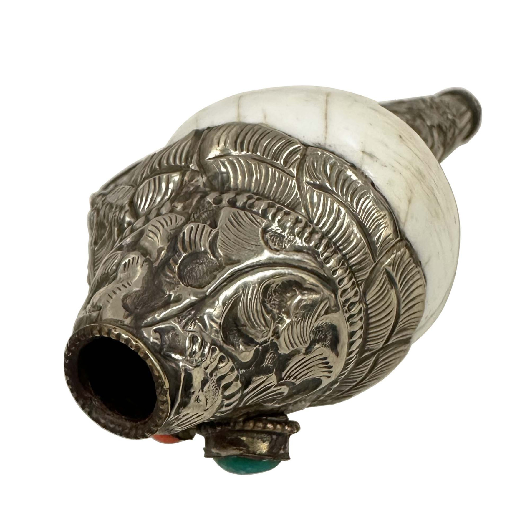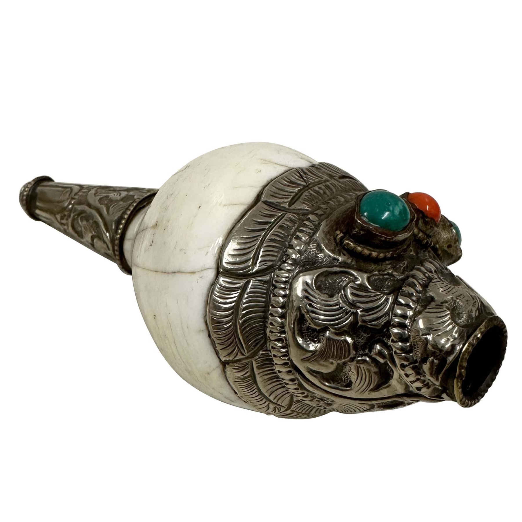 Tibetan ritual conch shell trumpet, also known as a "Dungkar" in Tibetan Buddhism or "Shankha" in Sanskrit. These elaborately decorated conch shells, like the one pictured with silver and gemstone inlay hold significant spiritual and symbolic meaning in Tibetan Buddhist practices.