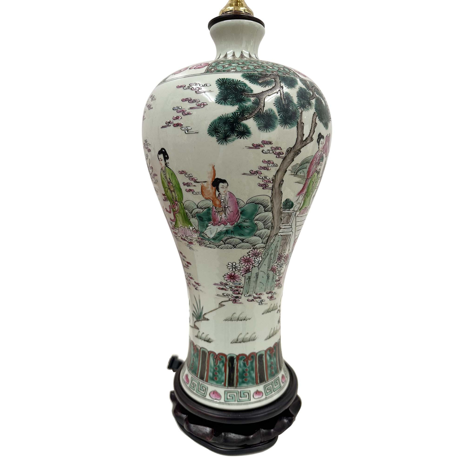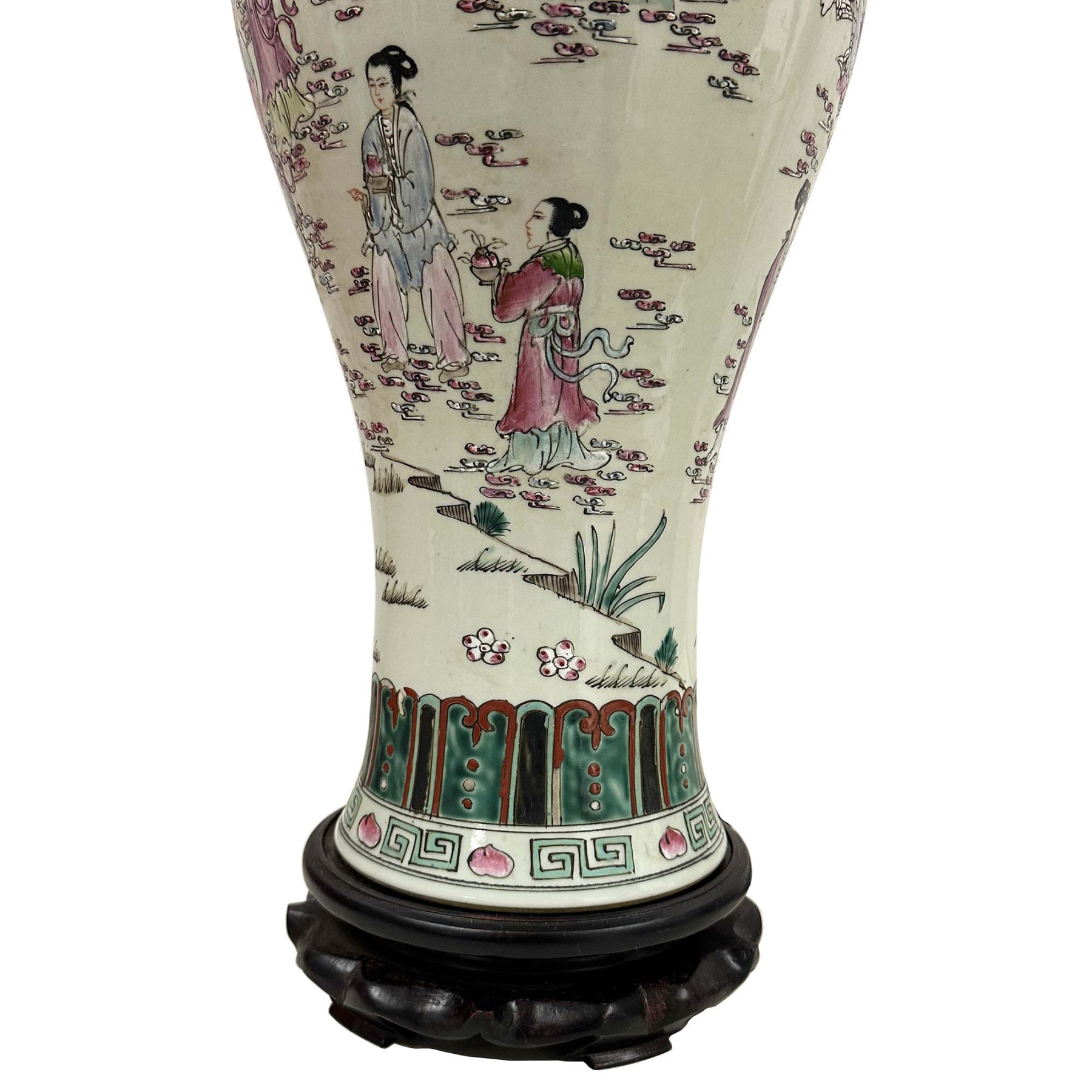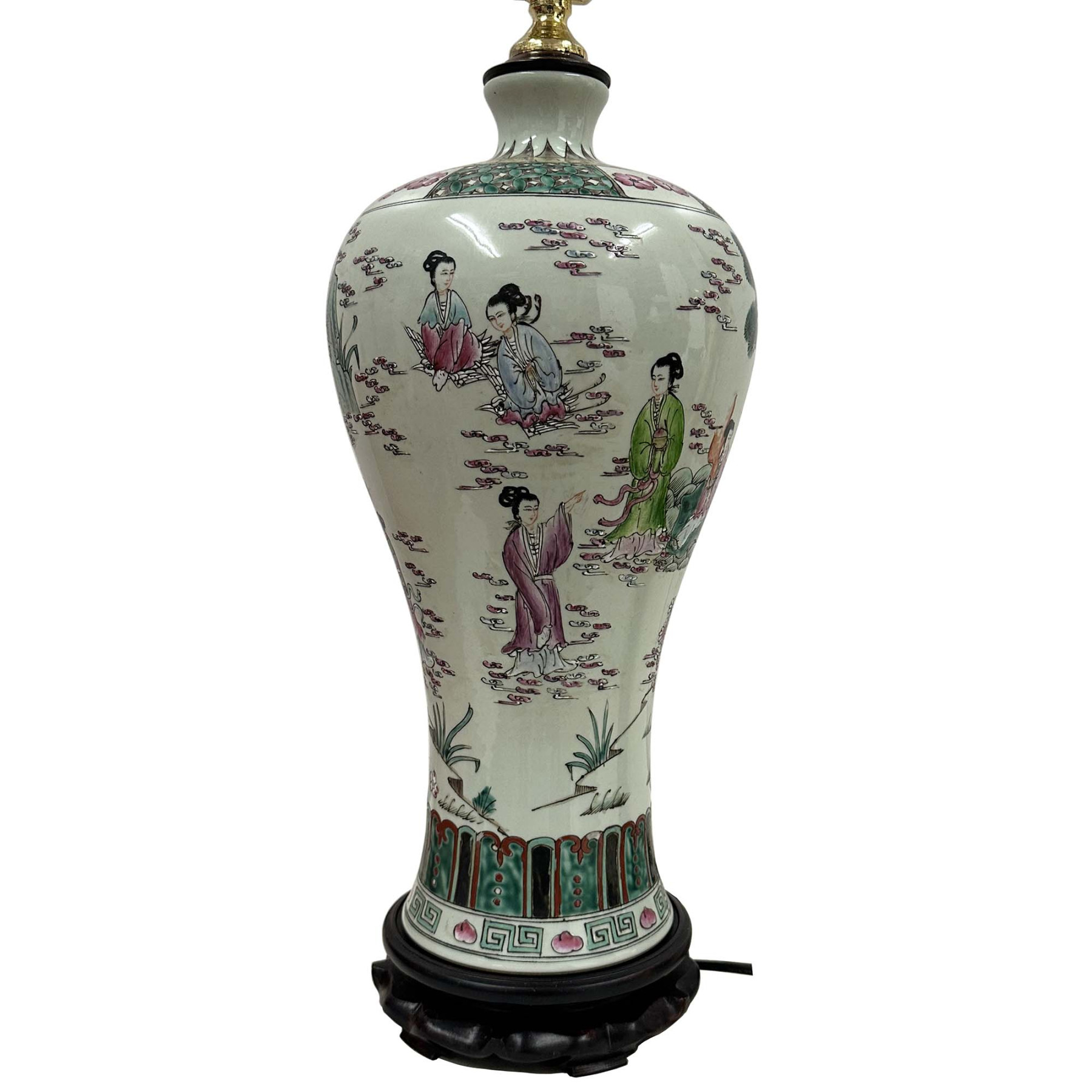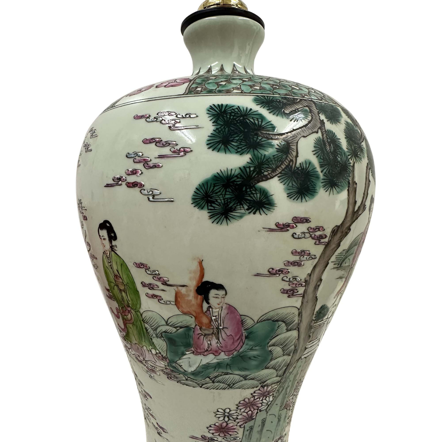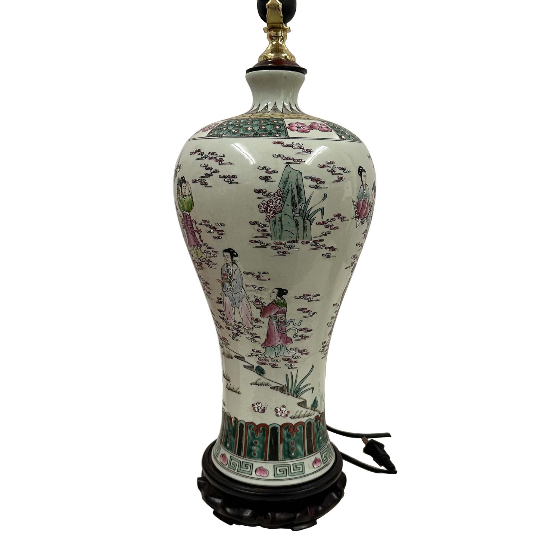 A vintage famille rose porcelain table lamp from the mid-20th century with fairies and landscaping design. Born in China during the mid-20th century, this vintage famille rose porcelain vase has been elegantly transformed into a table lamp. The vase, set on a dark wood circular base, is adorned with intricate patterns depicting fairies and Pine trees. The delicate Famille Rose lends a timeless appeal to the piece, making it a versatile addition to various interior styles. Wired for the US, this lamp is both functional and decorative, perfect for illuminating a cozy corner or adding a touch of elegance to a room. Its refined aesthetic makes it an ideal choice for placement atop a demilune table, commode, or enfilade, where it can complement other decorative elements. The detailed scenes depicted on the lamp evoke a sense of serenity and cultural richness, making this vintage Chinese porcelain table lamp a sophisticated addition to any home. Whether placed in a living room, bedroom, or study, it will undoubtedly enhance the ambiance with its graceful presence and understated charm.