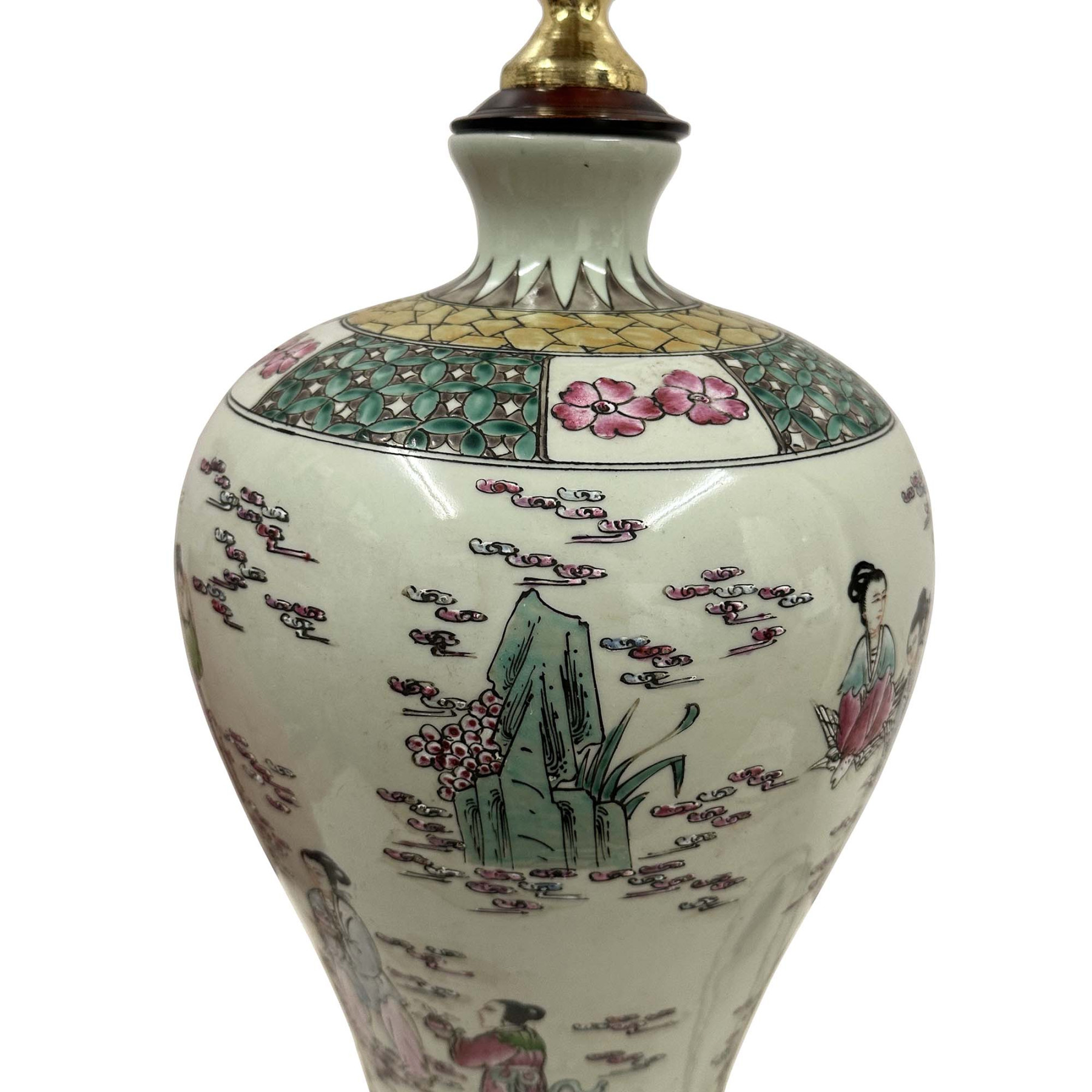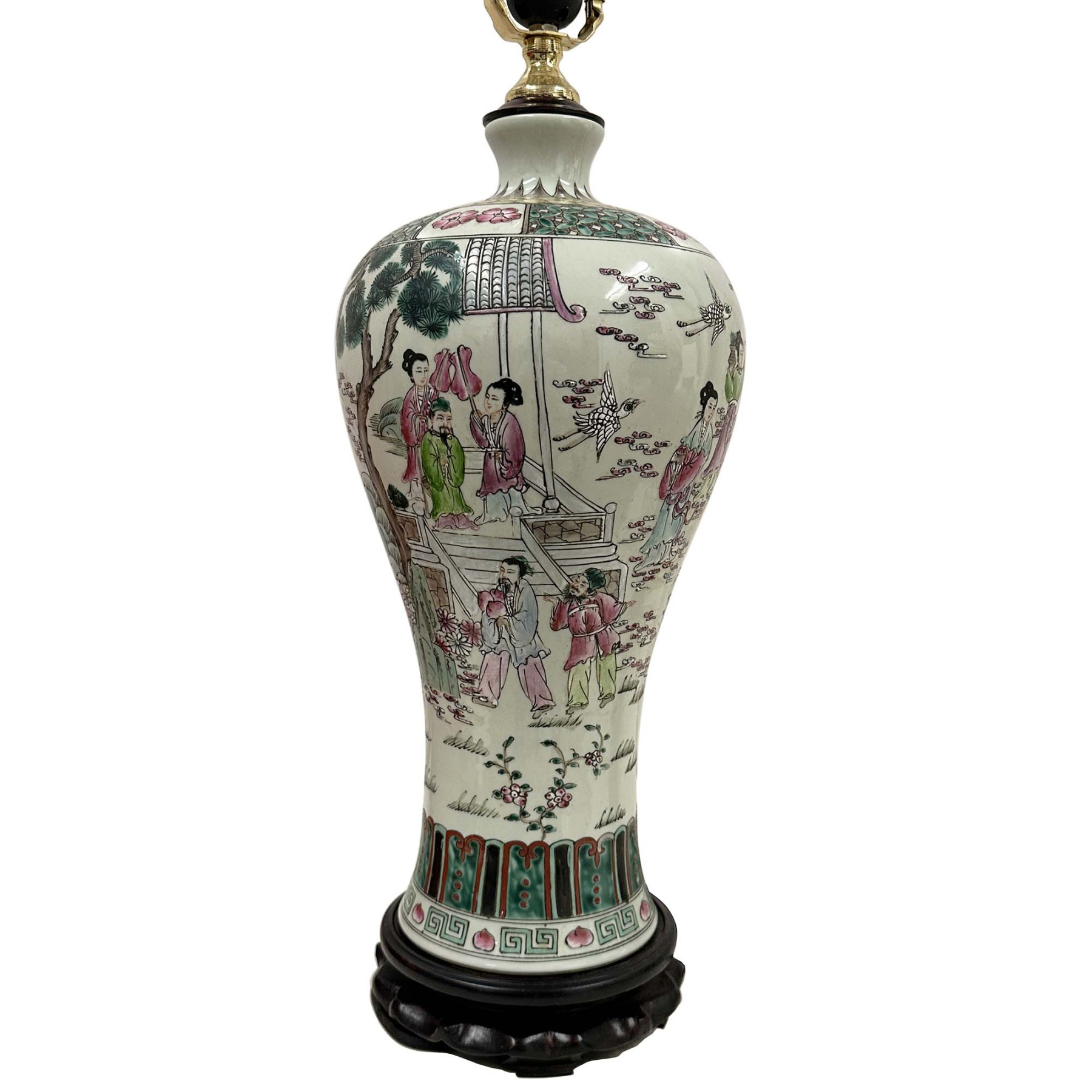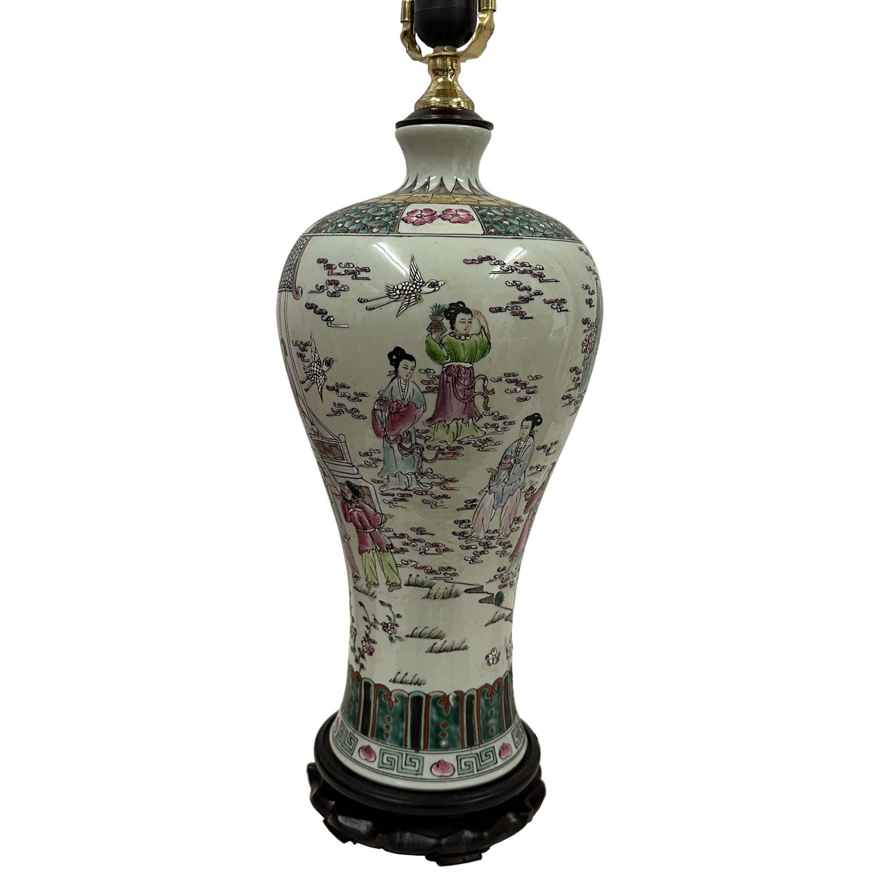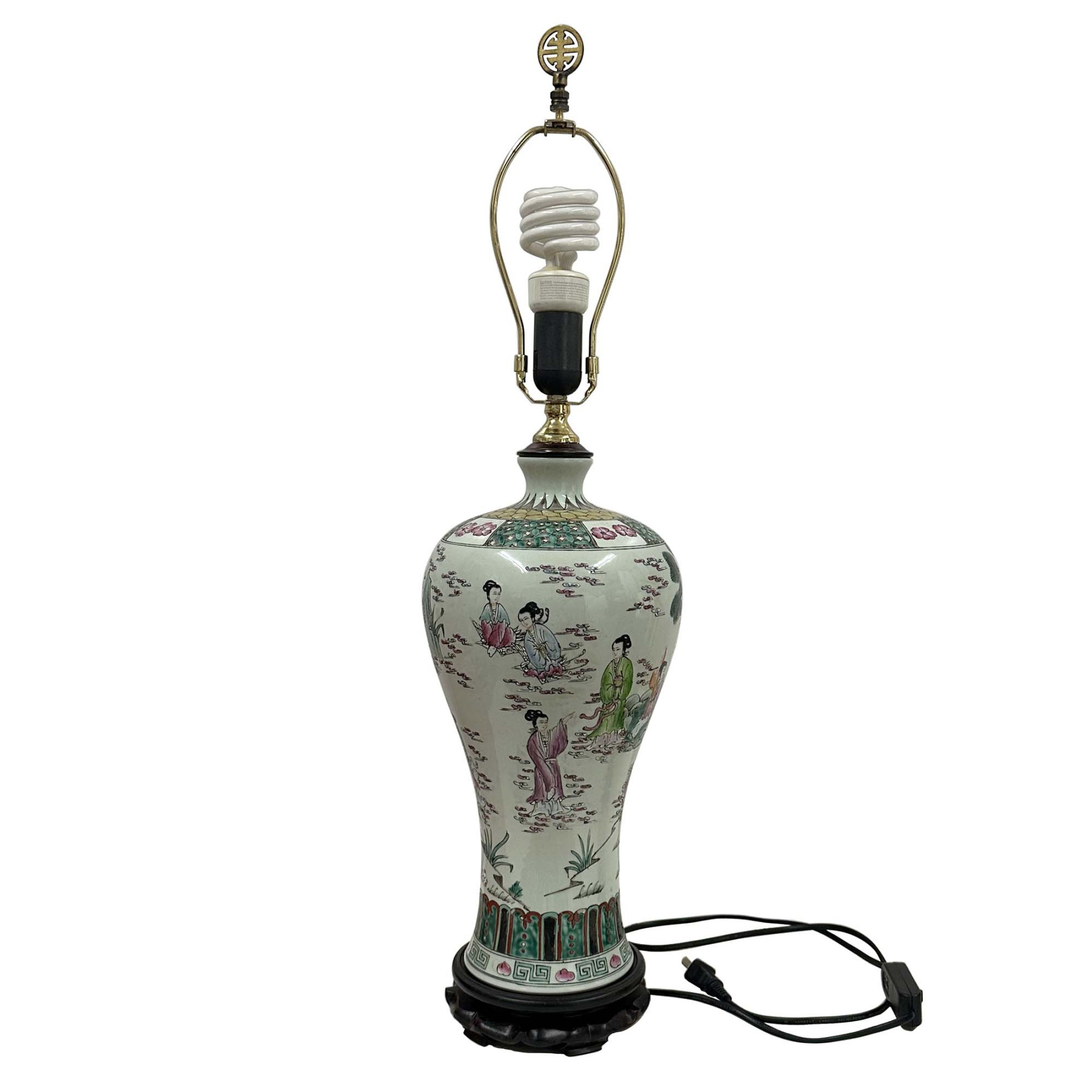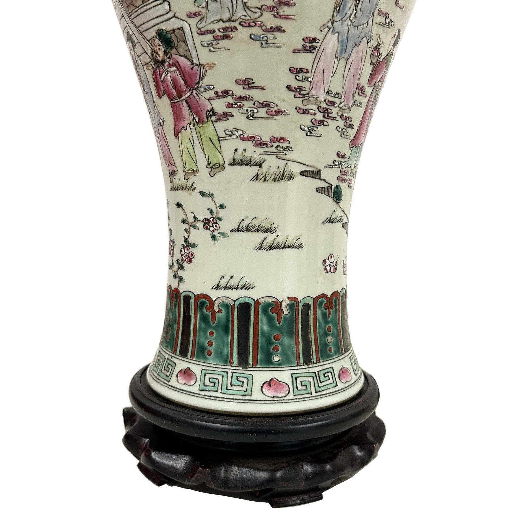 A vintage famille rose porcelain table lamp from the mid-20th century with fairies and landscaping design. Born in China during the mid-20th century, this vintage famille rose porcelain vase has been elegantly transformed into a table lamp. The vase, set on a dark wood circular base, is adorned with intricate patterns depicting fairies and Pine trees. The delicate Famille Rose lends a timeless appeal to the piece, making it a versatile addition to various interior styles. Wired for the US, this lamp is both functional and decorative, perfect for illuminating a cozy corner or adding a touch of elegance to a room. Its refined aesthetic makes it an ideal choice for placement atop a demilune table, commode, or enfilade, where it can complement other decorative elements. The detailed scenes depicted on the lamp evoke a sense of serenity and cultural richness, making this vintage Chinese porcelain table lamp a sophisticated addition to any home. Whether placed in a living room, bedroom, or study, it will undoubtedly enhance the ambiance with its graceful presence and understated charm.