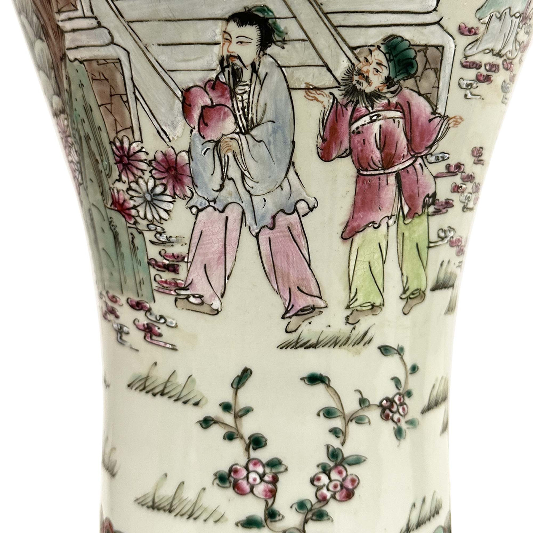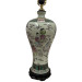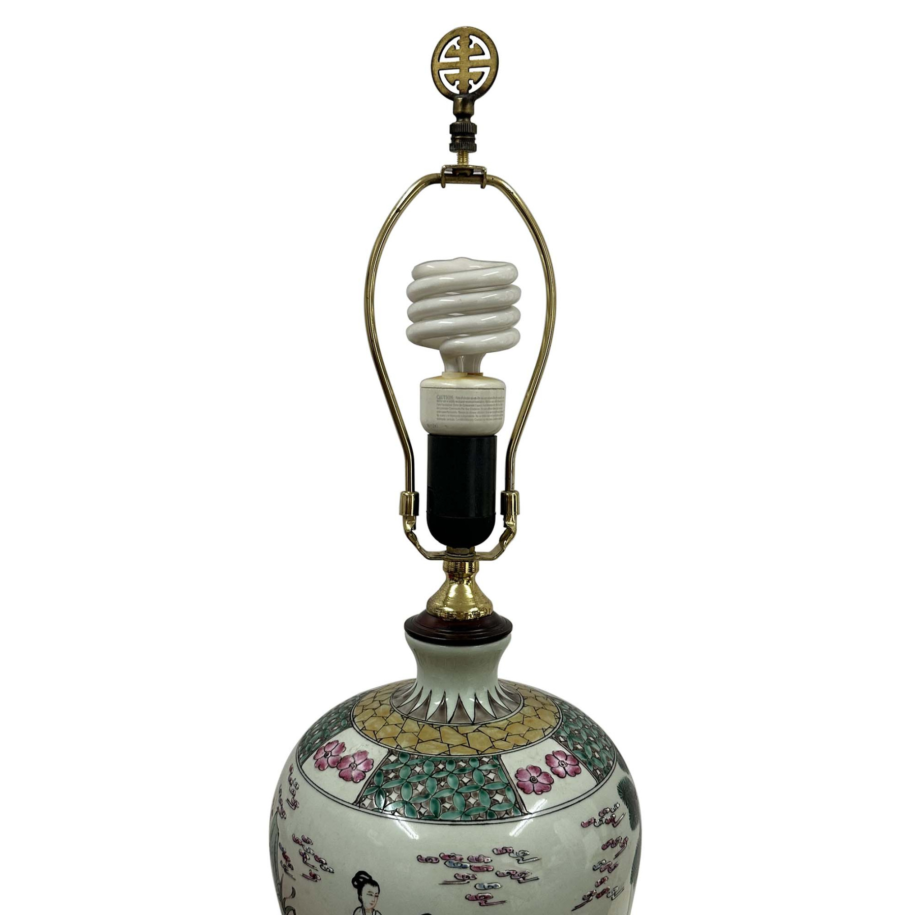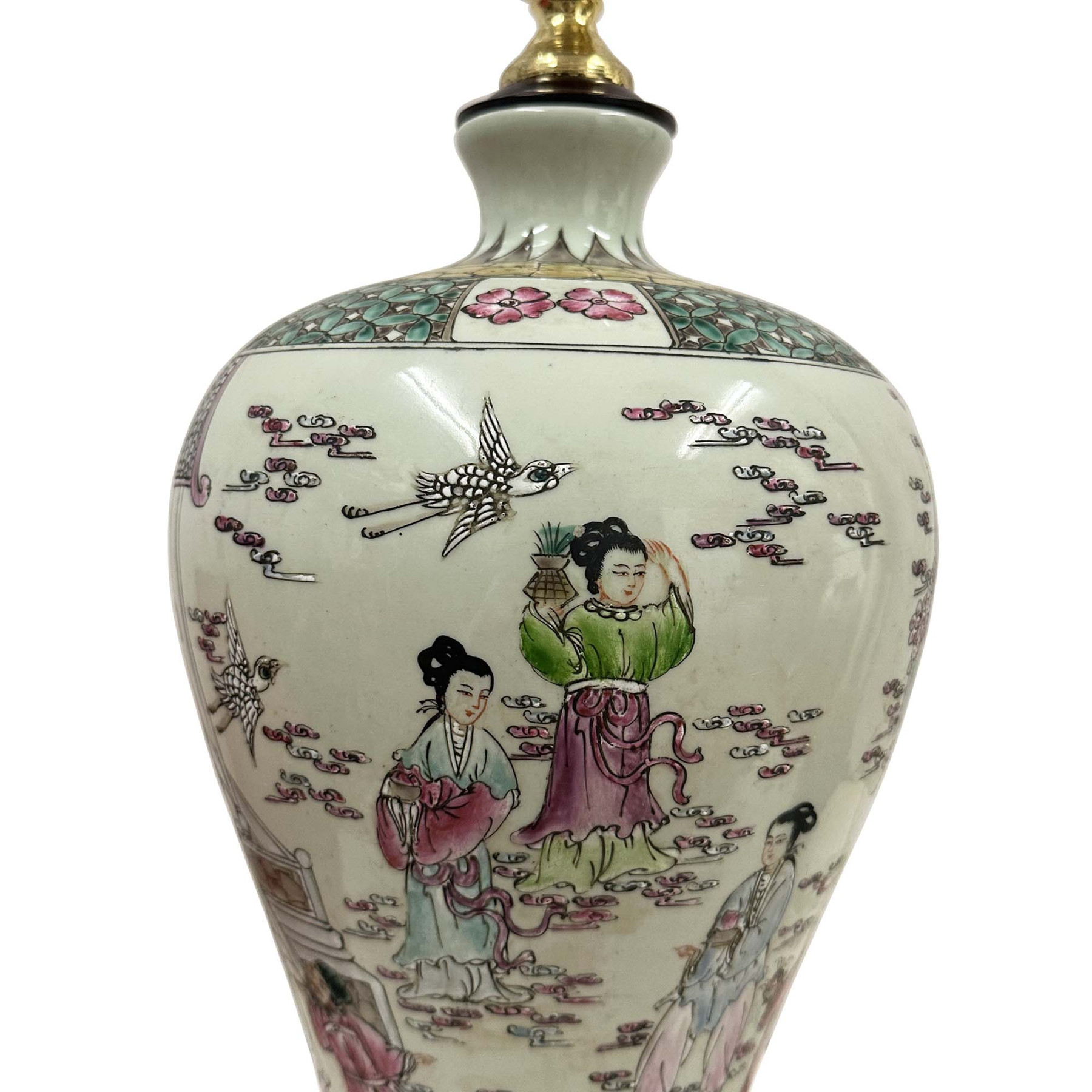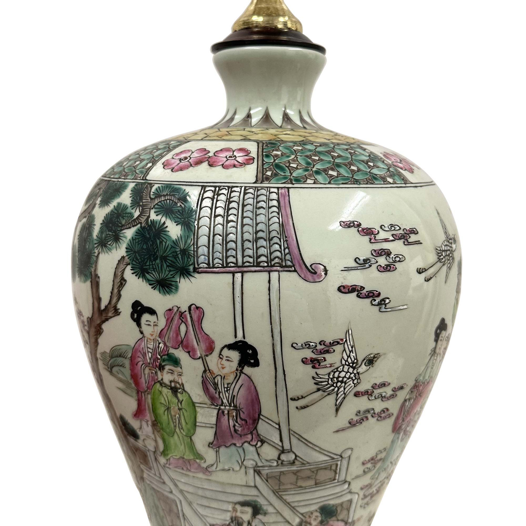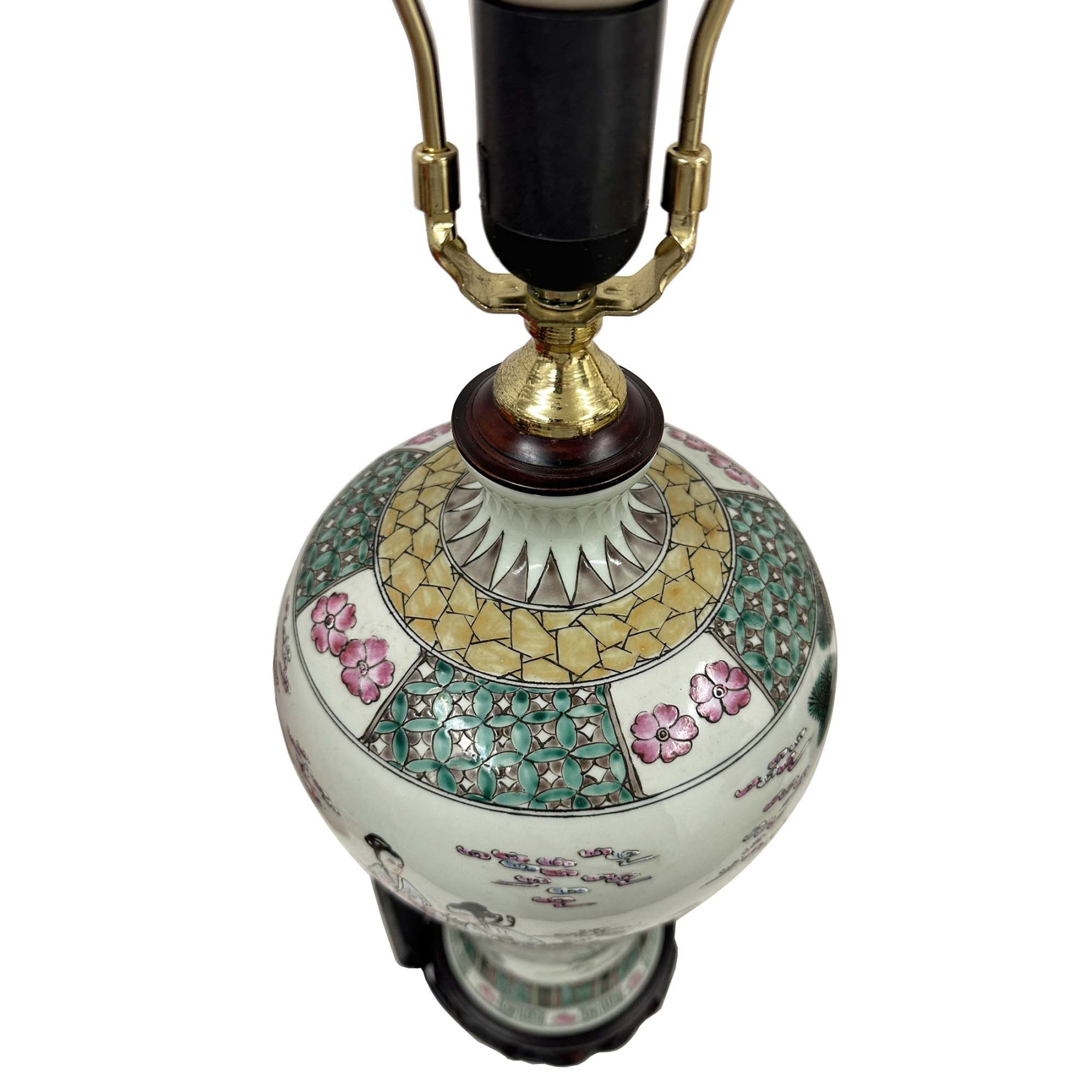A vintage famille rose porcelain table lamp from the mid-20th century with fairies and landscaping design. Born in China during the mid-20th century, this vintage famille rose porcelain vase has been elegantly transformed into a table lamp. The vase, set on a dark wood circular base, is adorned with intricate patterns depicting fairies and Pine trees. The delicate Famille Rose lends a timeless appeal to the piece, making it a versatile addition to various interior styles. Wired for the US, this lamp is both functional and decorative, perfect for illuminating a cozy corner or adding a touch of elegance to a room. Its refined aesthetic makes it an ideal choice for placement atop a demilune table, commode, or enfilade, where it can complement other decorative elements. The detailed scenes depicted on the lamp evoke a sense of serenity and cultural richness, making this vintage Chinese porcelain table lamp a sophisticated addition to any home. Whether placed in a living room, bedroom, or study, it will undoubtedly enhance the ambiance with its graceful presence and understated charm.