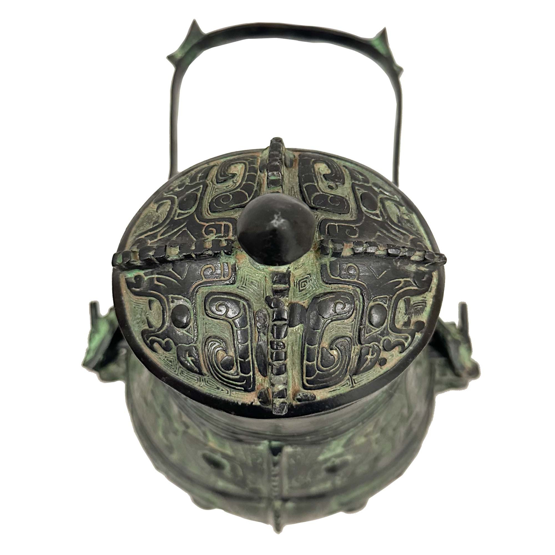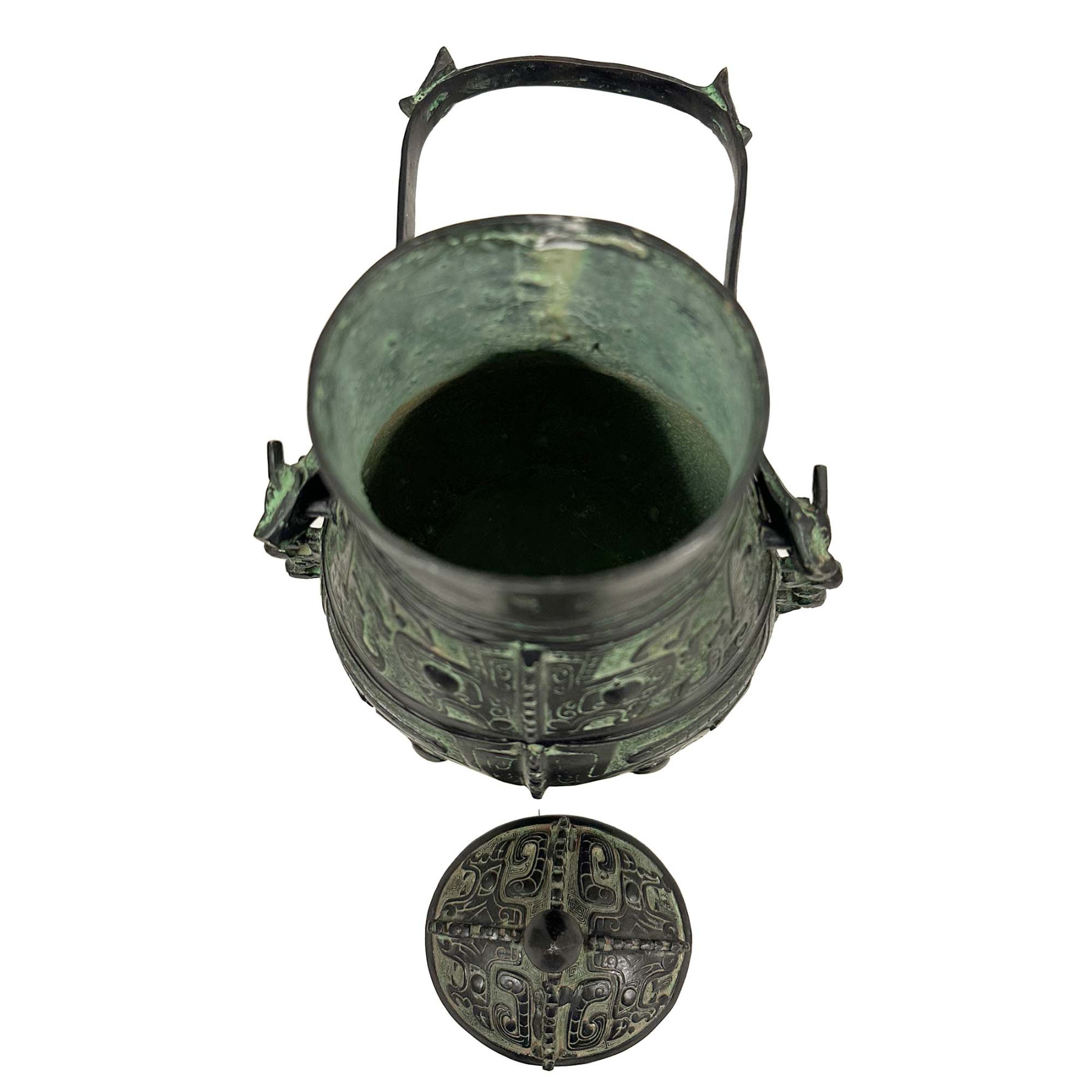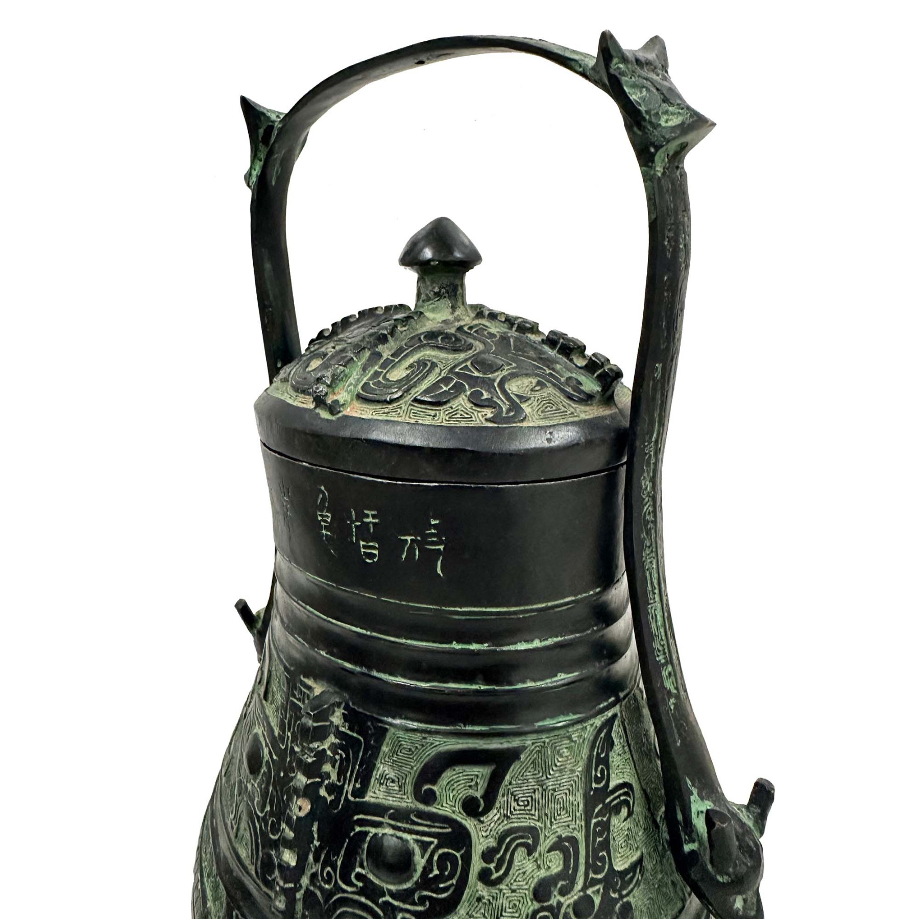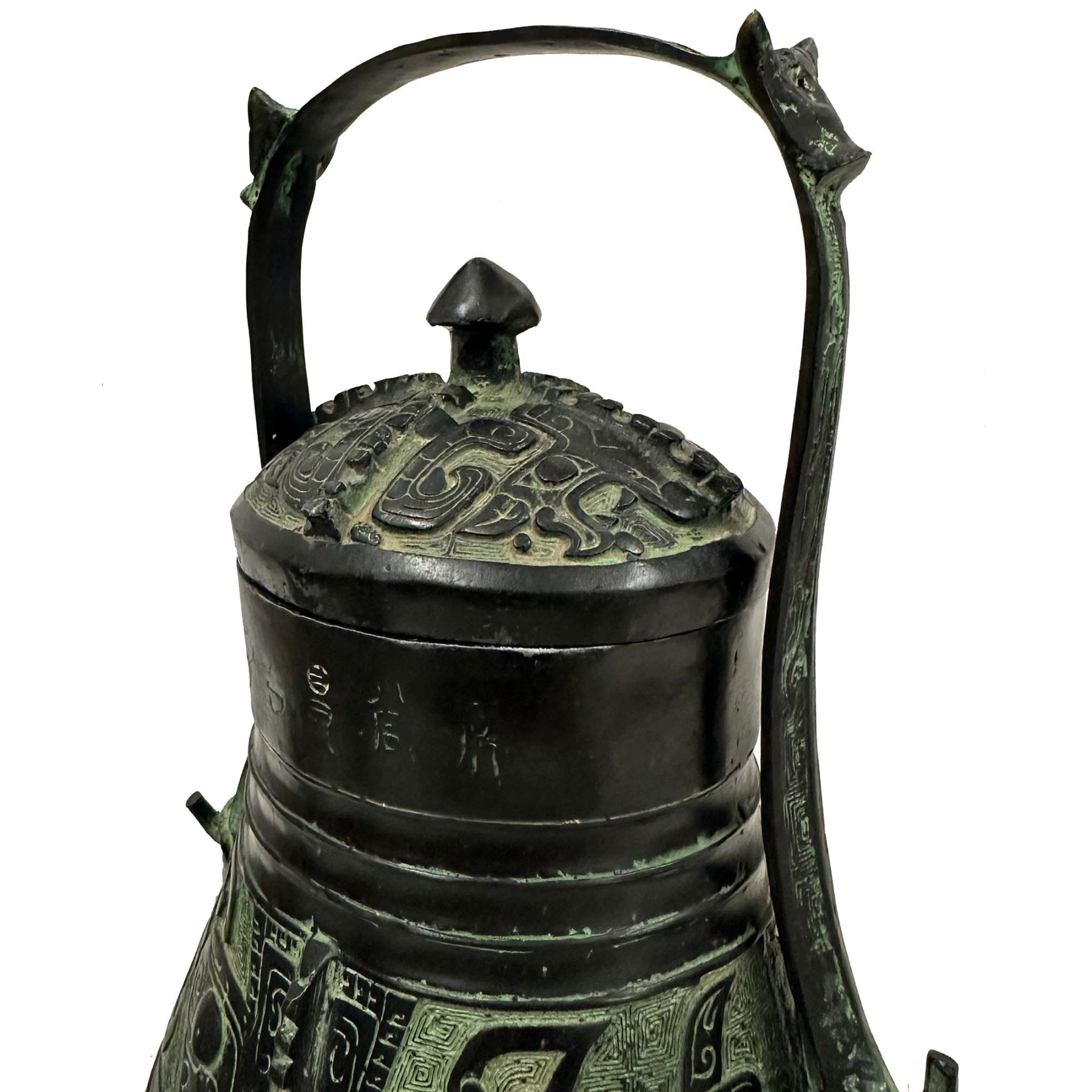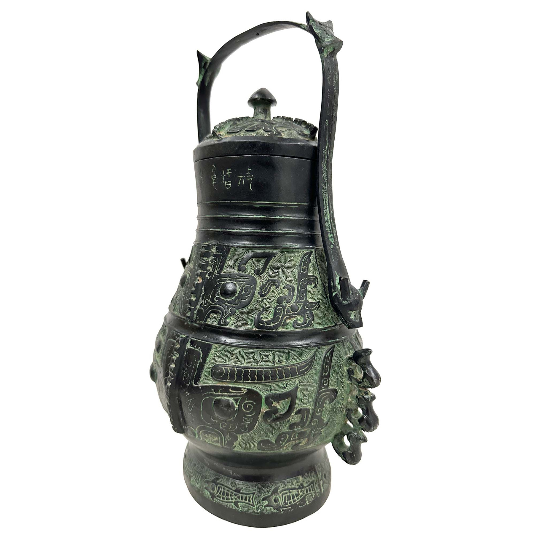 This object is a high quality reproduction of Chinese ritual wine vessel, commonly known as a You (提梁卣). These vessels were used in ancient China, particularly during the Shang and Zhou dynasties, for storing and pouring ceremonial wine in ritual sacrifices. The large, arching overhead handle is a defining characteristic of the "You" form. It features prominent Taotie (mythical beast face) motifs, a staple of archaic Chinese bronze art. The neck of this specific vessel bears a seal script inscription, which often records the maker, owner, or the specific ritual occasion it was cast for.