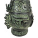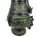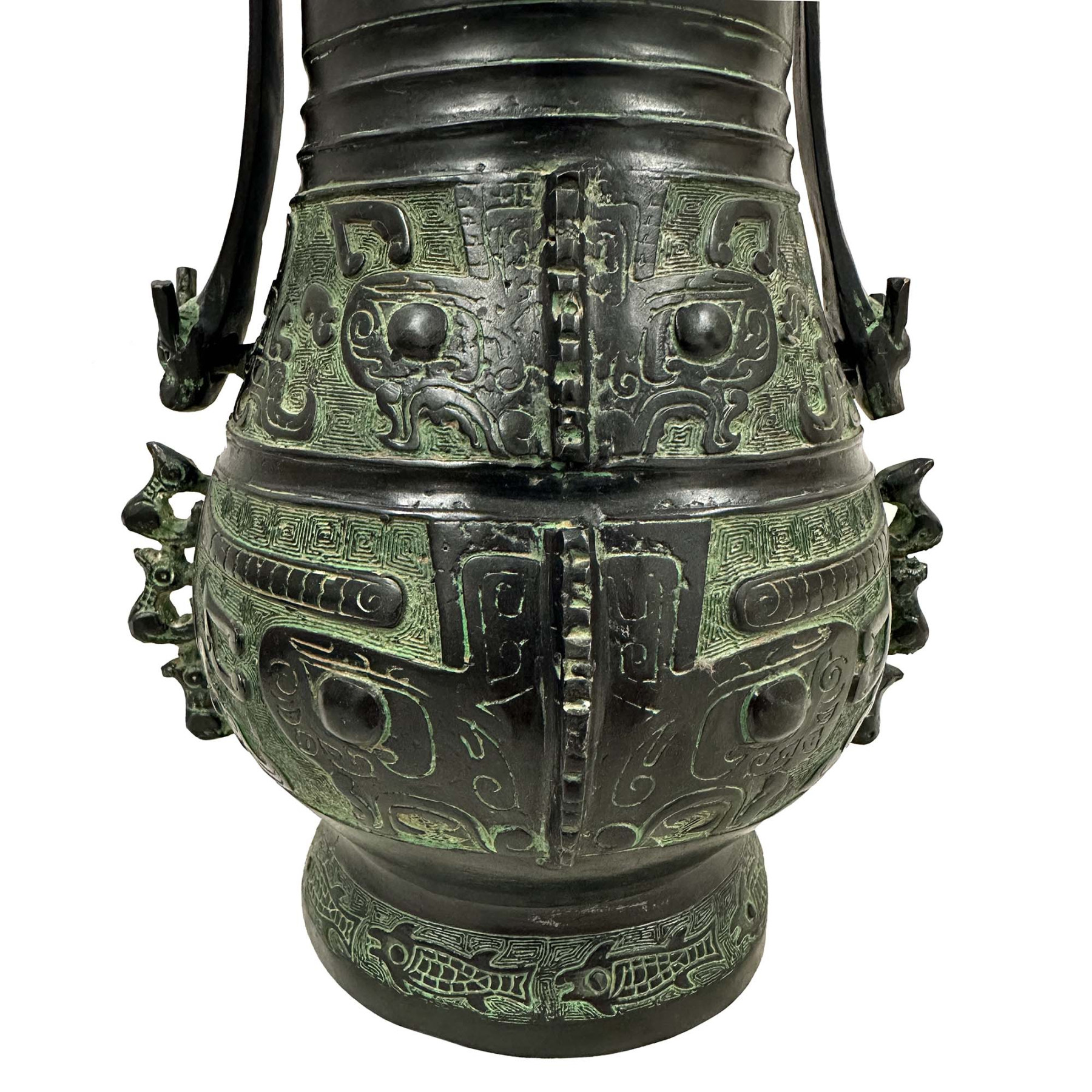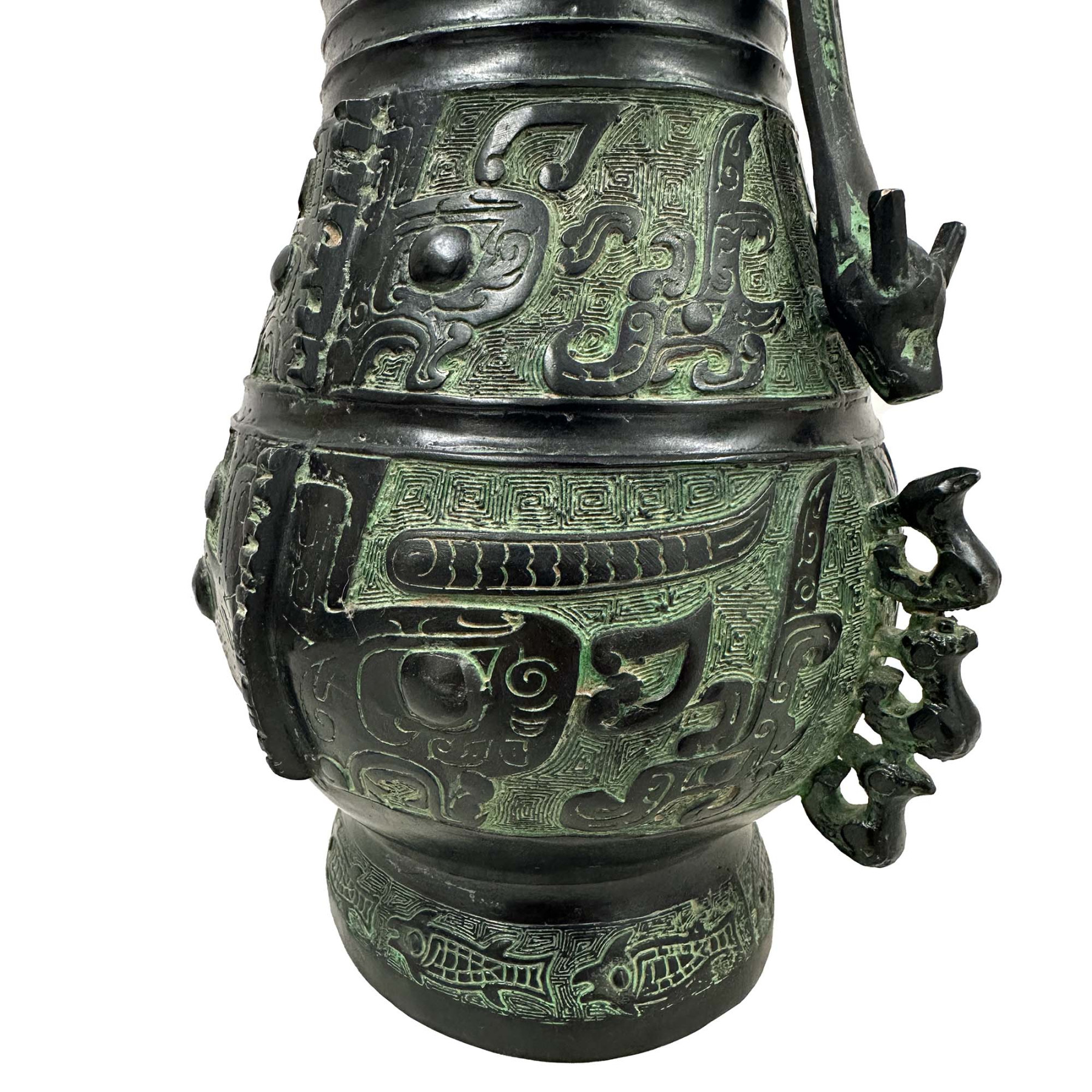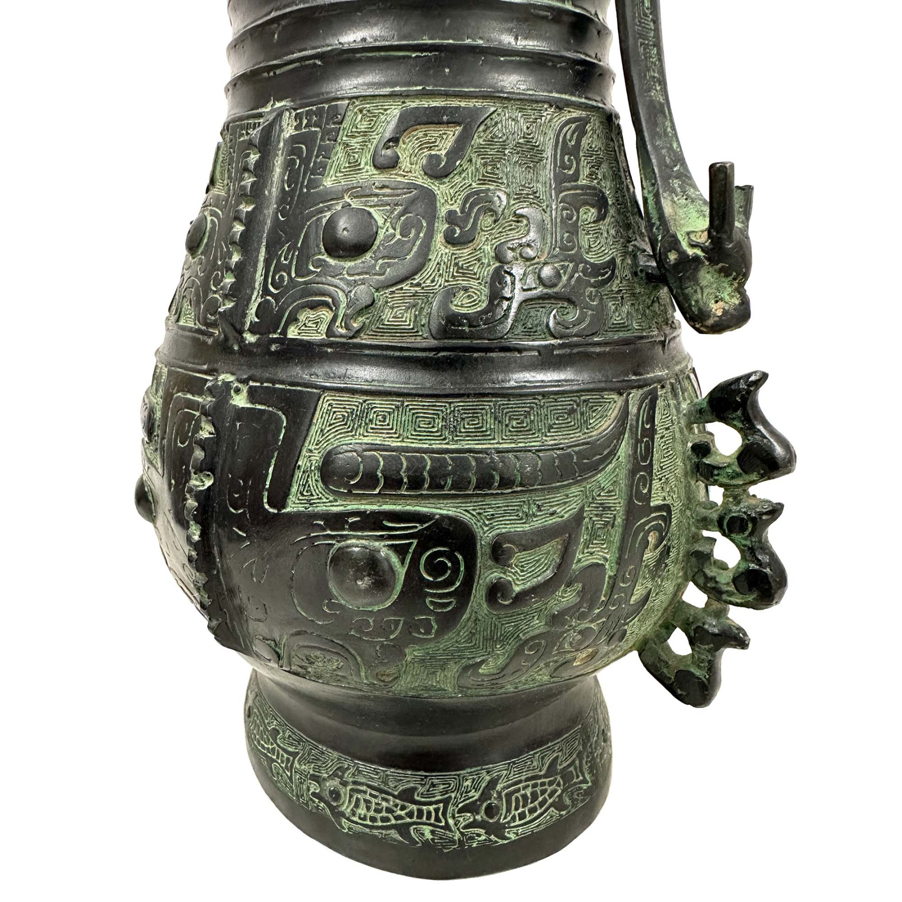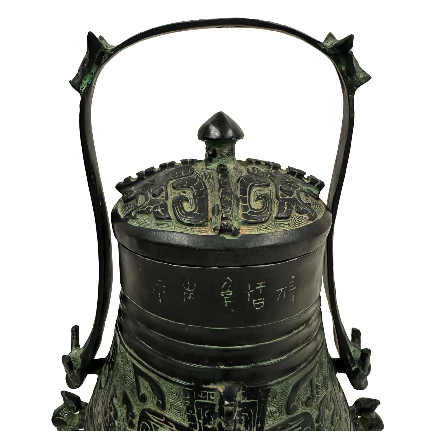This object is a high quality reproduction of Chinese ritual wine vessel, commonly known as a You (提梁卣). These vessels were used in ancient China, particularly during the Shang and Zhou dynasties, for storing and pouring ceremonial wine in ritual sacrifices. The large, arching overhead handle is a defining characteristic of the "You" form. It features prominent Taotie (mythical beast face) motifs, a staple of archaic Chinese bronze art. The neck of this specific vessel bears a seal script inscription, which often records the maker, owner, or the specific ritual occasion it was cast for.
